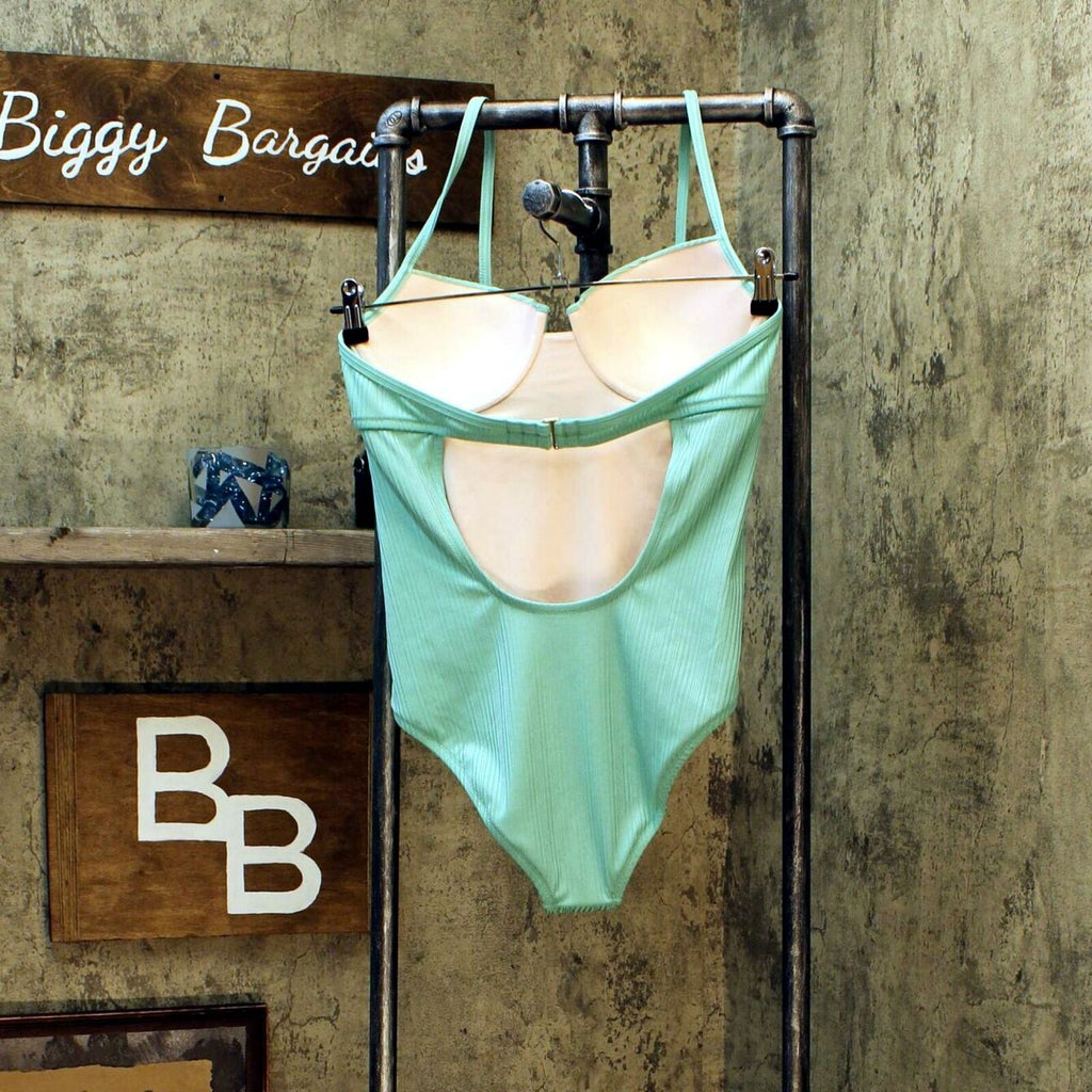 Go chic and stylish this swim season with a Cabana Light-Lift Rib-Knit One-Piece Swimsuit from Sun & Shore. Featuring a light sea-green color, this structured one-piece swimsuit has molded cups for shaping and support, along with a spaghetti-strap halter for an adjustable fit. The back is finished with a hook-and-loop closure that helps keep the suit in place, while the rib-knit fabric lends subtle texture. Pair it with a sunnies and sandals for a day spent lounging beachside, or wear it with a sarong and a wide-brim hat for a stroll on the beach -- No matter how you style it, you'll love the polished, classic look it adds to your summer swim wardrobe.