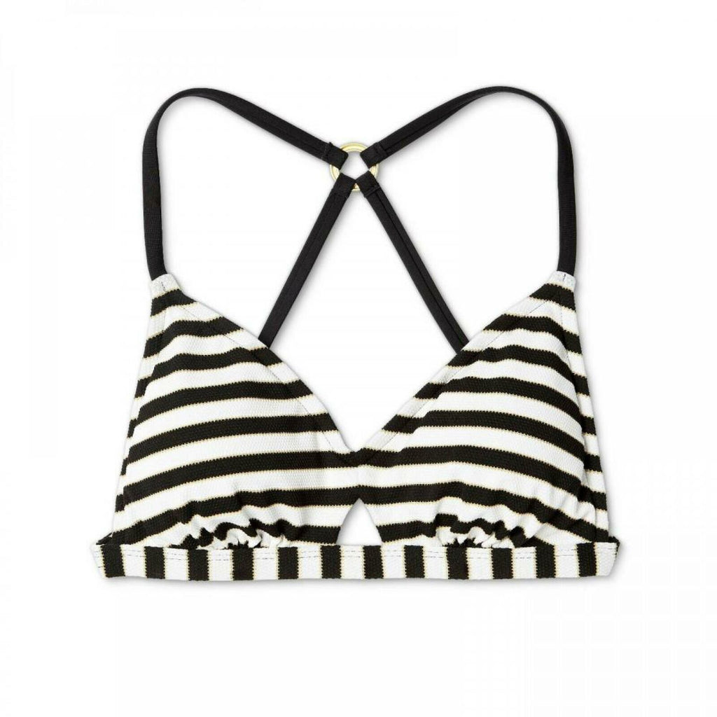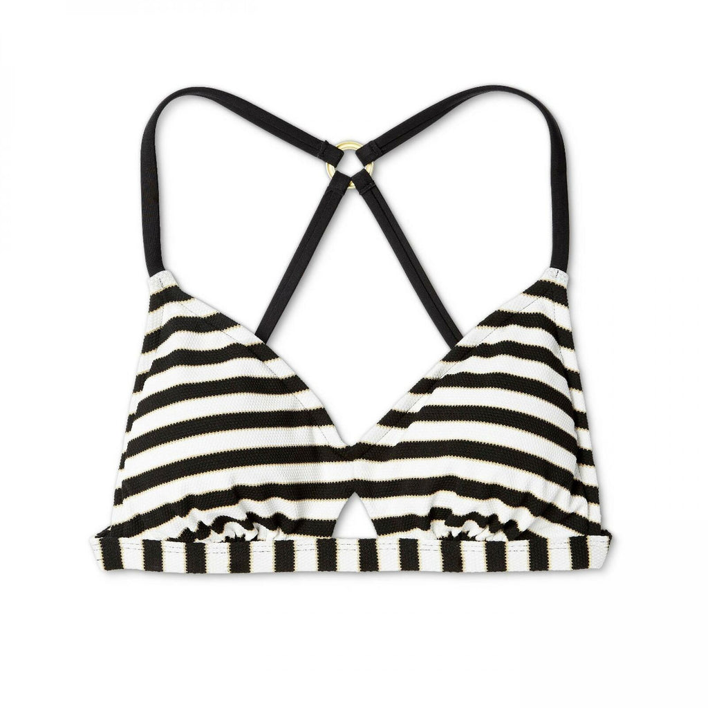 This Textured Peek-a-Boo Cross-Back Bralette Bikini Top from Shade & Shore brings just the right touch of unique style to your collection of swimwear pieces. Made with an incredibly soft fabric with just the right touch of stretch from added spandex, this bralette bikini top features a classically chic black and white stripe pattern with a hint of subtle texture for an effortlessly stylish look. A V-neckline and peek-a-boo cutout at the bust add to the chic appeal, while the crisscrossing straps tie at the back to help give you just the right fit. Complete with removable cups for customizable and comfortable wear, this striped bralette bikini top is a great staple to add to your collection of swimwear pieces.