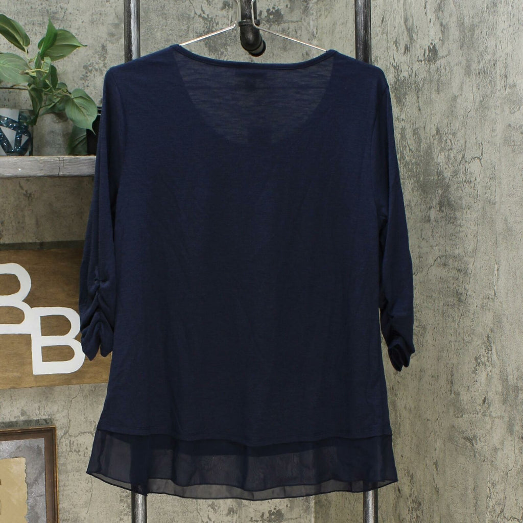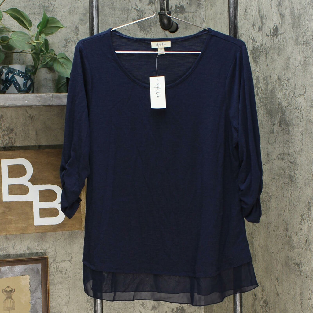 Scoop neckline; three-quarter-sleeves with ruching and chiffon hem