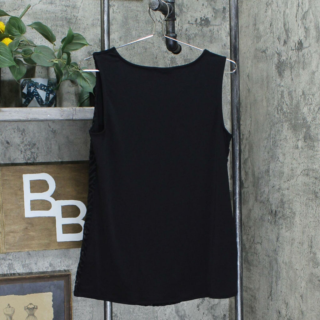 Tank Features: lace front overlay, sleeveless, straight bottom hem