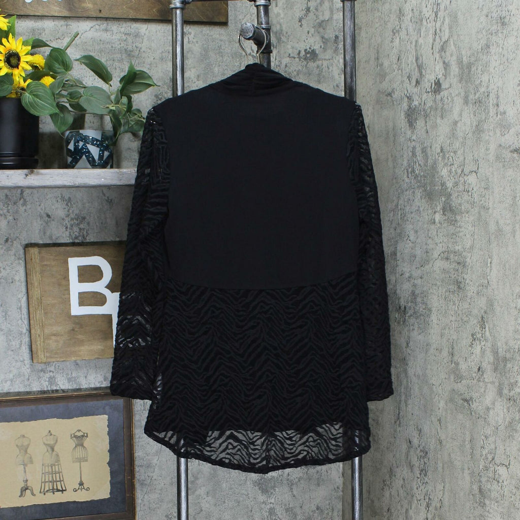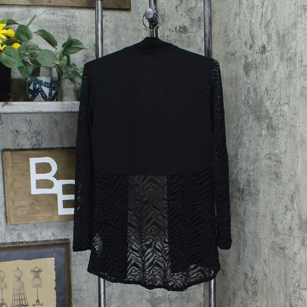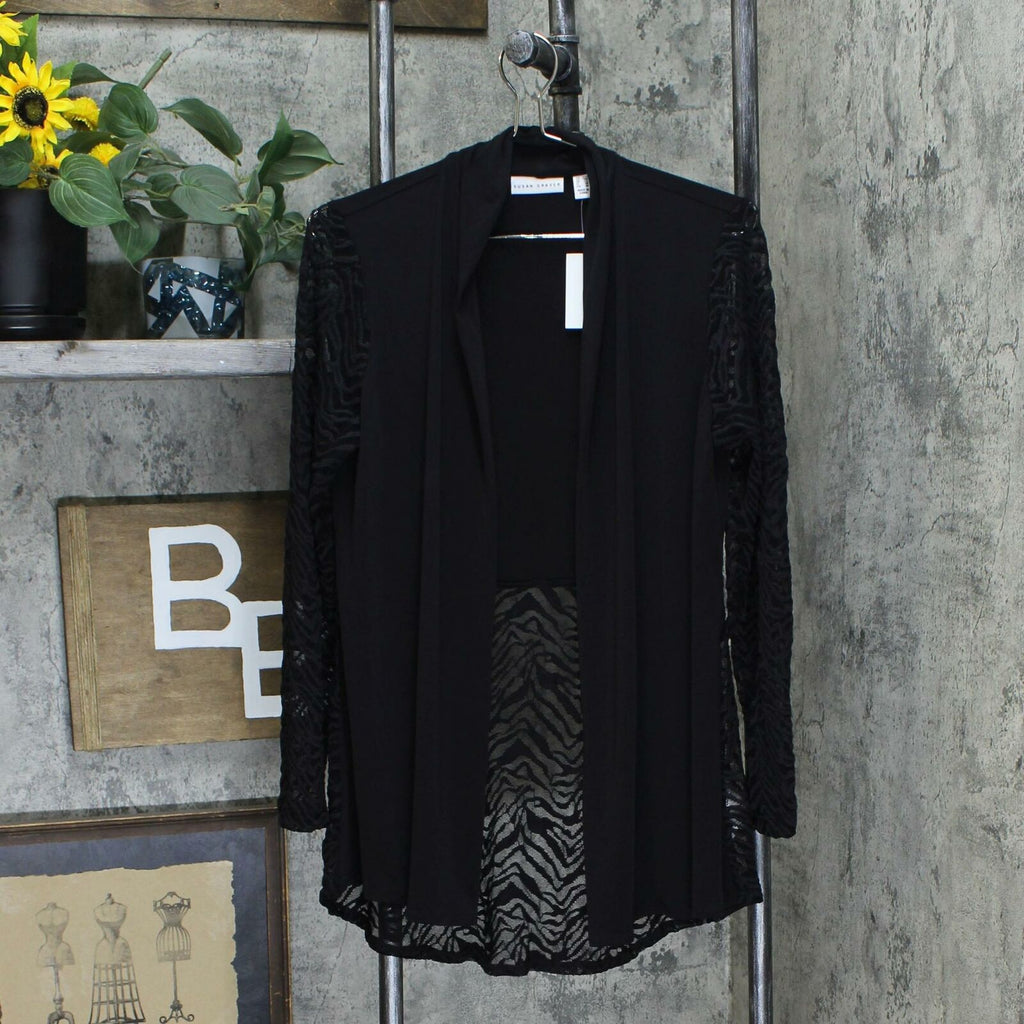 Cardigan Features: Liquid Knit front panel and back yoke, lace long sleeves, lace half back, hi-low hem