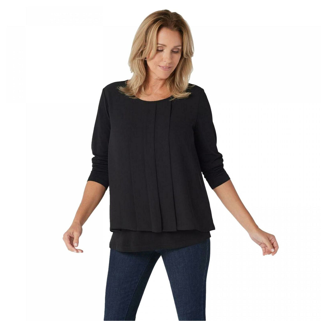 Features: chiffon front pleated overlay, back chiffon overlay, scoop neckline, long sleeves, straight bottom hem with side slits