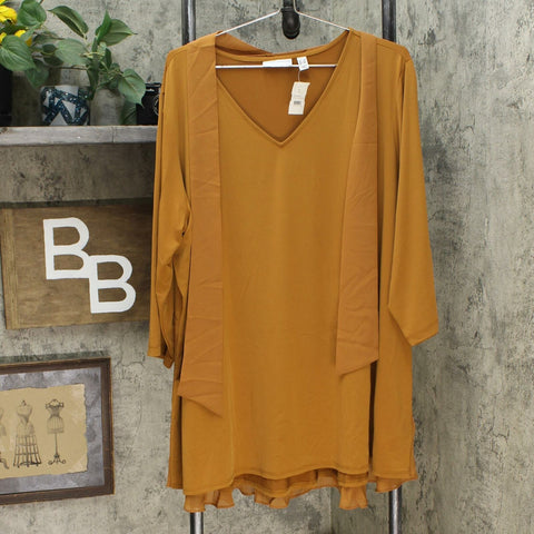 Features: V-neckline, 3/4-length sleeves, removable chiffon tie, peplum back with chiffon overlay, hi-low hem