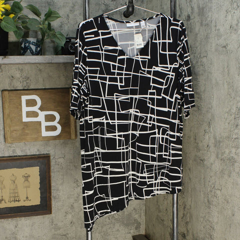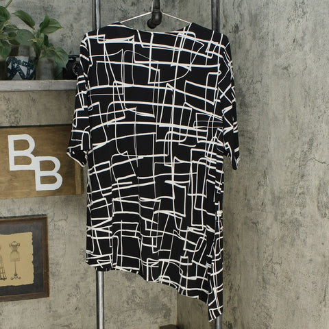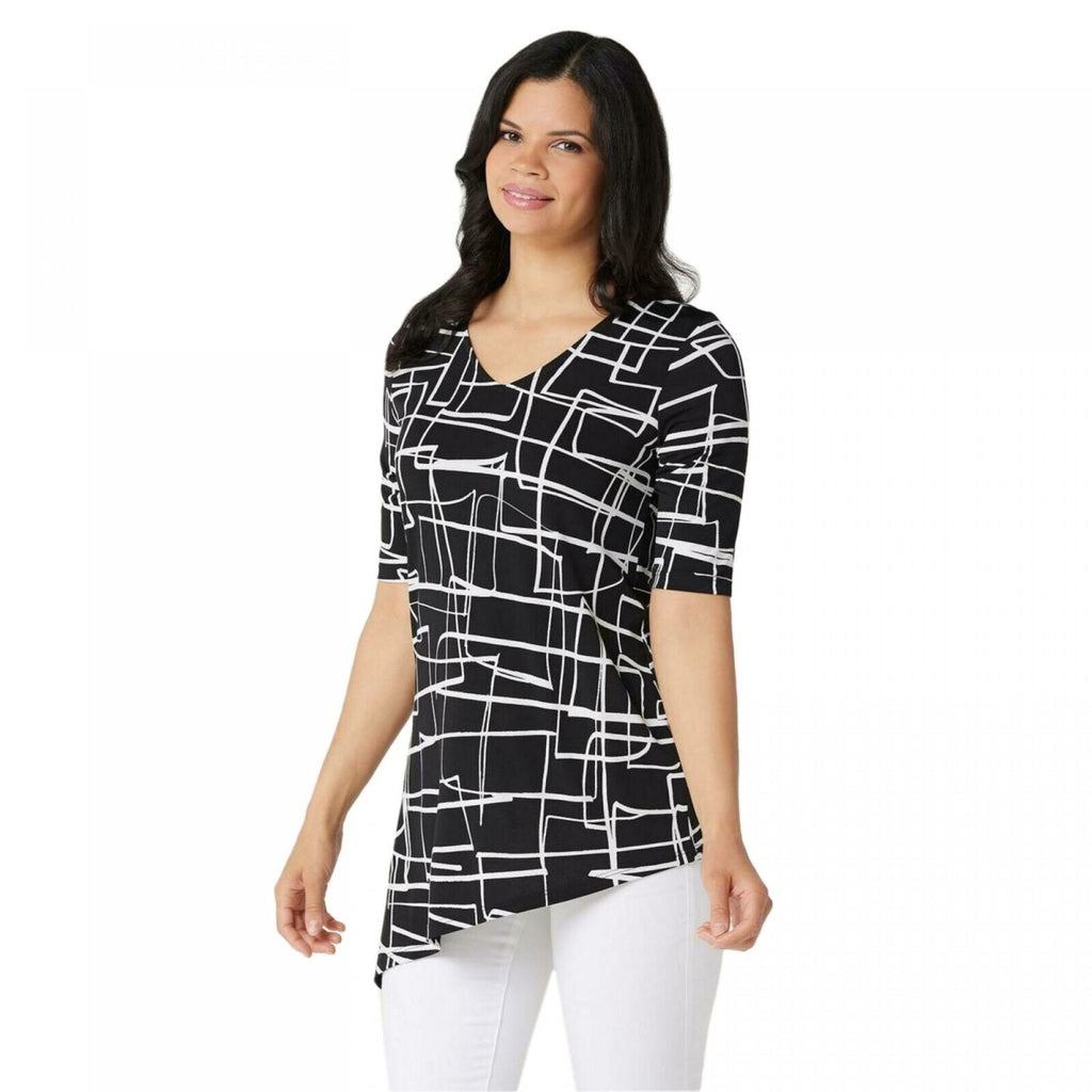 Soft and flattering with an asymmetrical hem--this printed tunic is sure to get regular wear with its elegant flair.