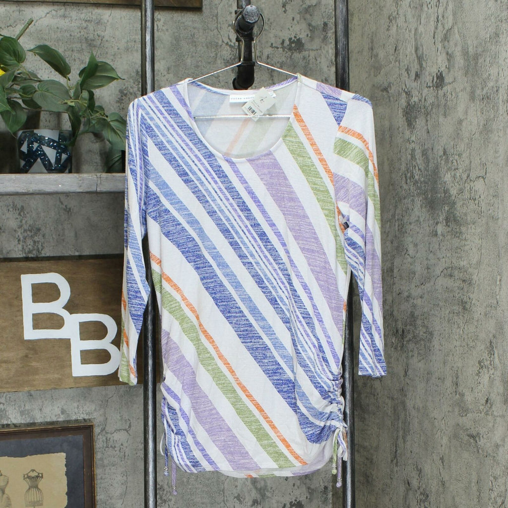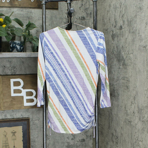 Features: drawstrings, circle neckline, bracelet sleeves, ruching and tie detail on both sides at the hem