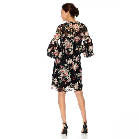 Design Features: Sheer mesh with dropped yoke; A-line dress; Fully lined bodice