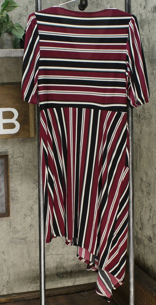 Stripes, stripes, stripes. This asymmetric hem dress radiates drama with clean lines that are never outdated. The complementary V-neck and sleeve drape make it a flattering choice for almost anyone. Add wedges for work, pumps for dinner and sandals for days spent idling through spring and summer.