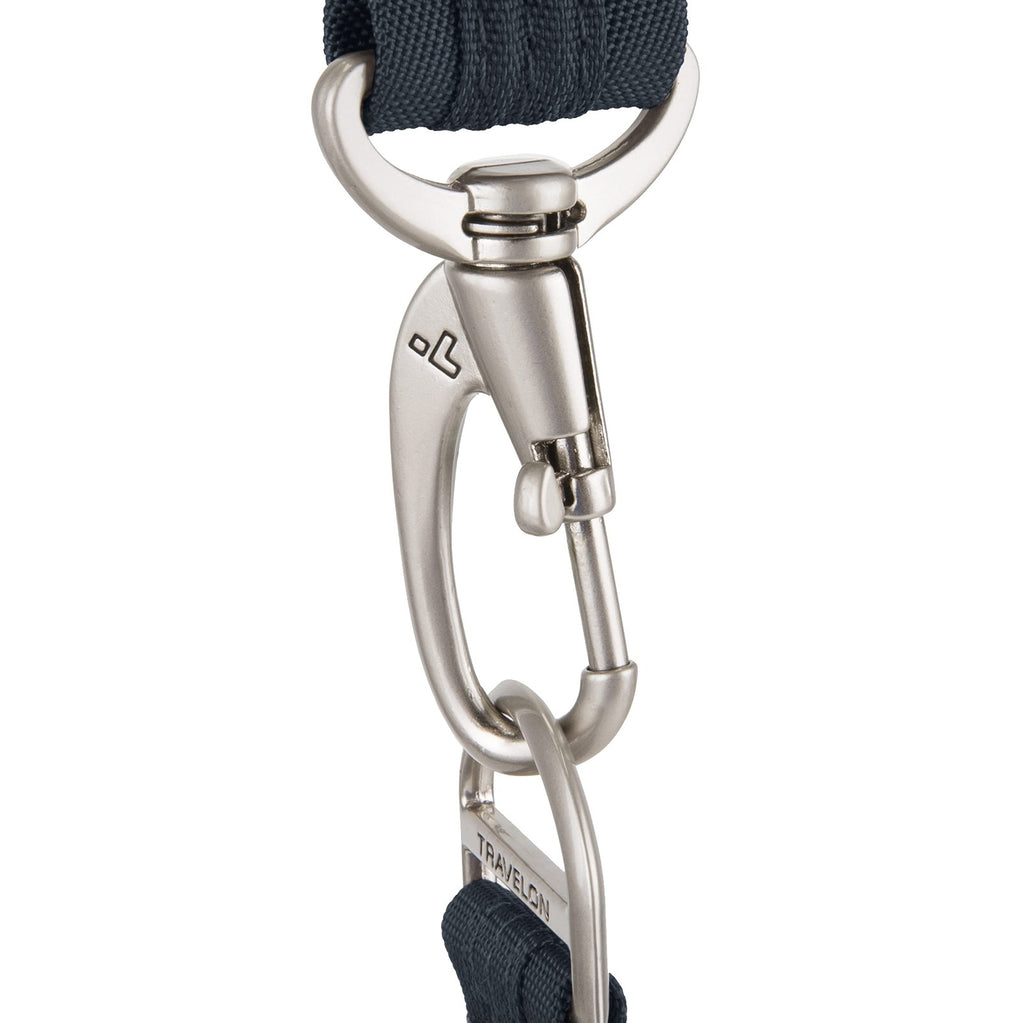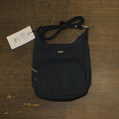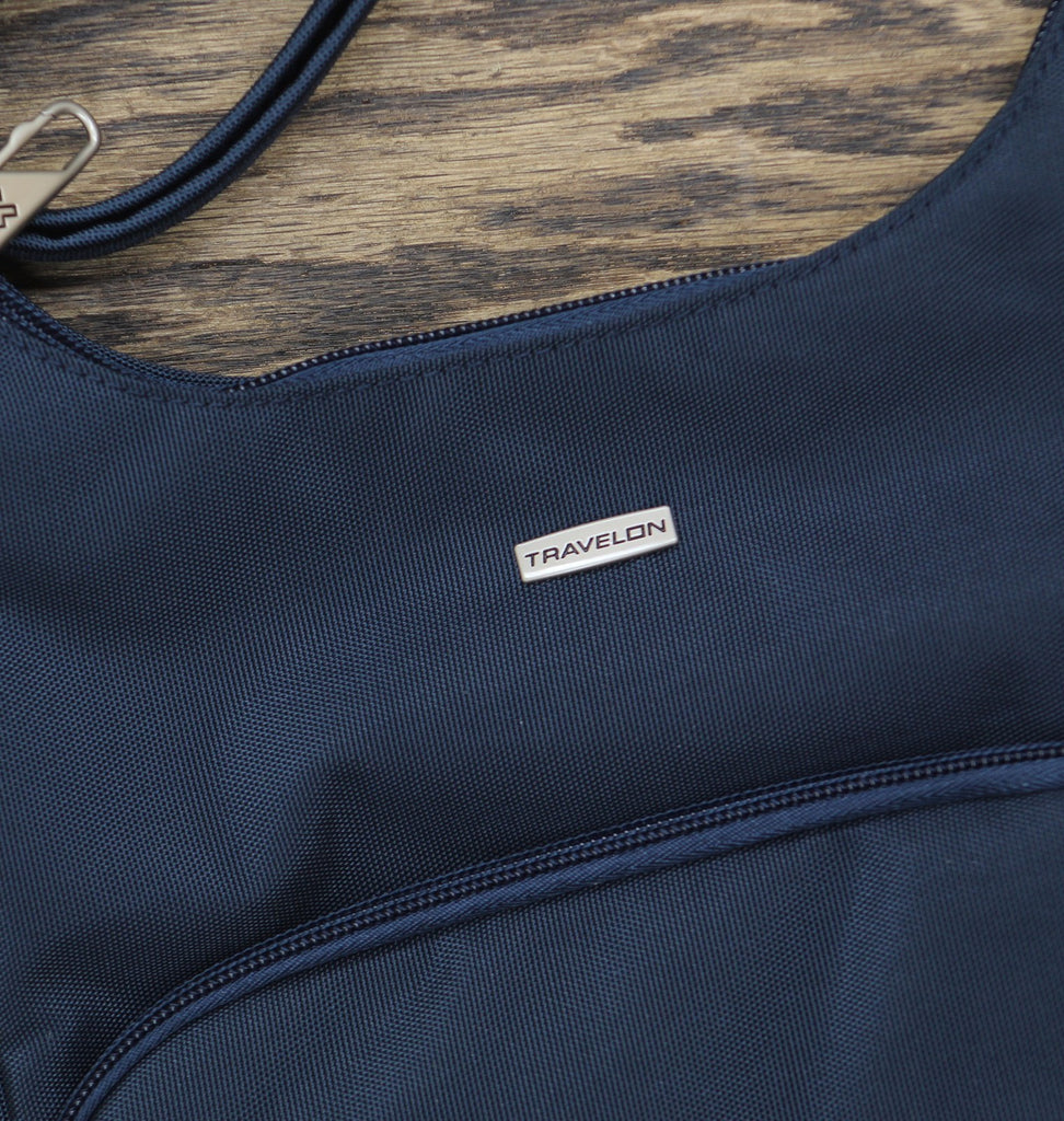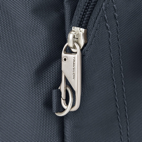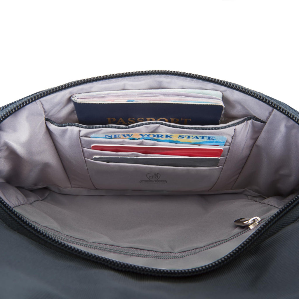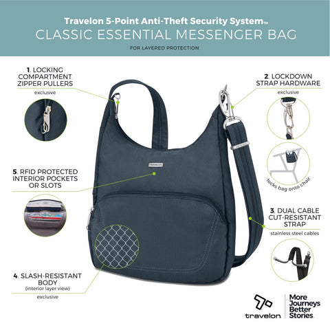 5-Point Anti-Theft security system Main compartment with interior organization panel with slip pocket and zippered pocket Slash-resistant body construction and slash-resistant, adjustable shoulderstrap attaches to post or chair. RFID blocking card and passport slots Front compartment with zippered pocket. Rear zippered pocket. Adjustable shoulder strap Product