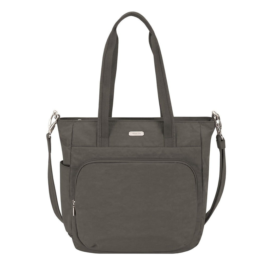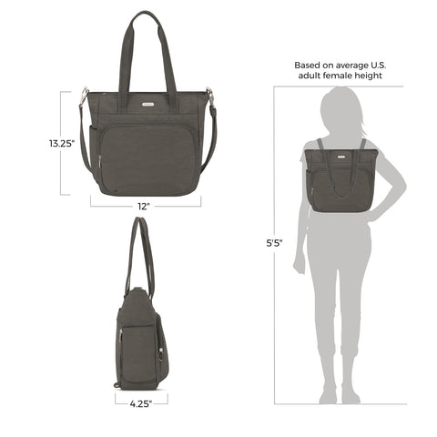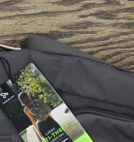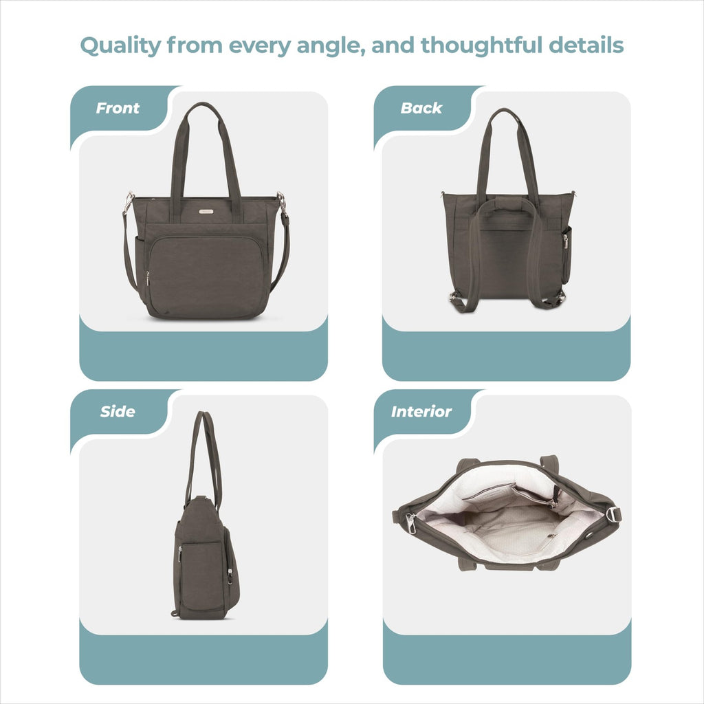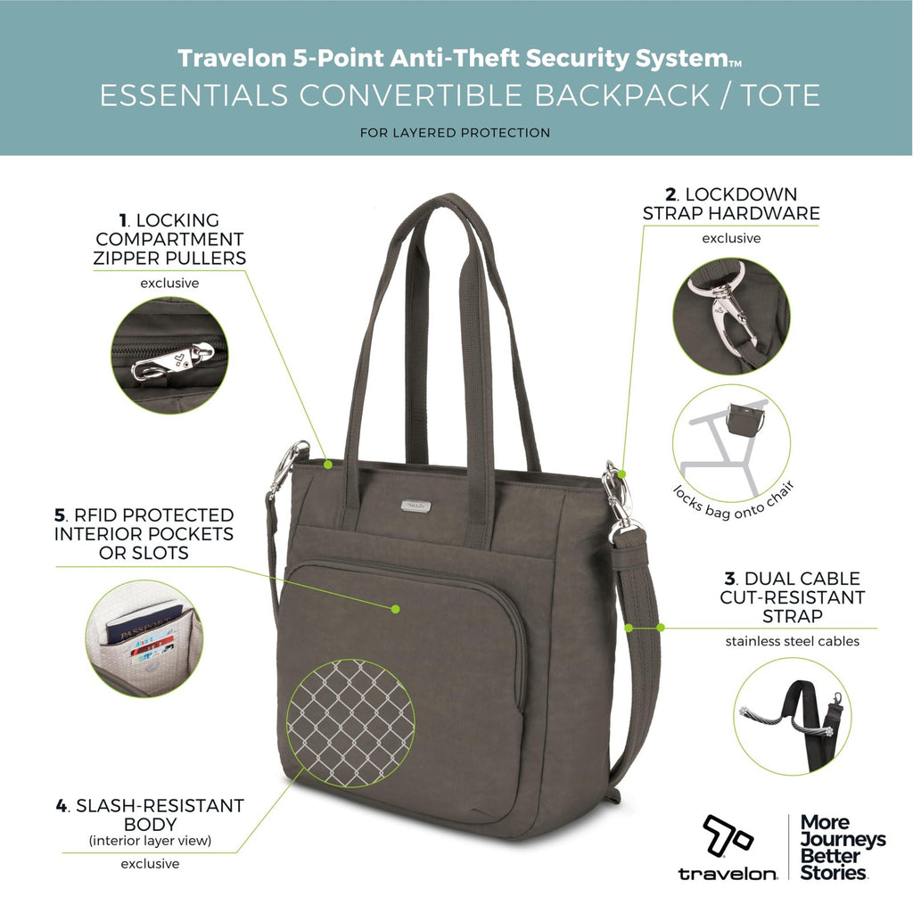 5-Point Anti-Theft security system features include slash resistant mesh body panels and straps, locking compartments, along with RFID blocking interior pockets Uniquely versatile, wear it 3 ways, as a tote, backpack, or crossbody. Convert from backpack to crossbody bag by removing and reattaching shoulder strap through rear panel tunnel. Interior features a business accessory organizer, zippered pocket, and slip pocket. Zippered mesh water bottle pocket. Rear luggage trolley strap conveniently slides over handle, allowing you to move easier and faster Large convenient front pocket with interior slip pockets for carrying essentials. Rear pass through strap for sliding over wheeled luggage handle. Product