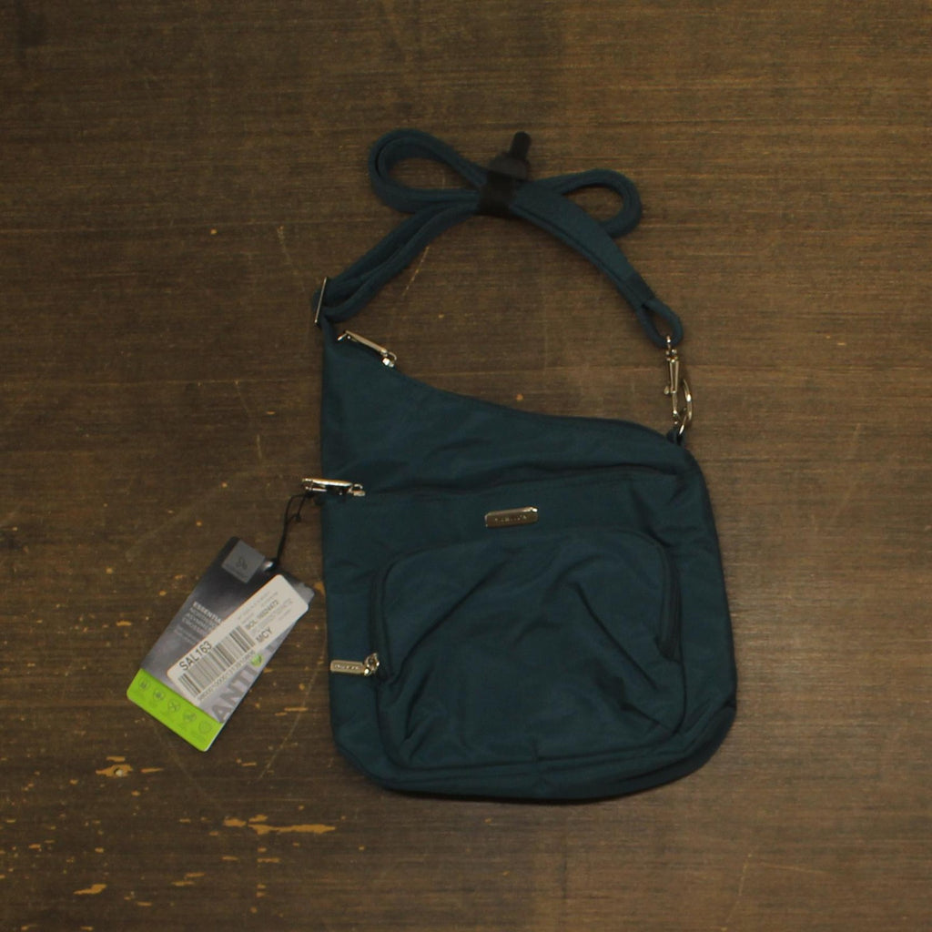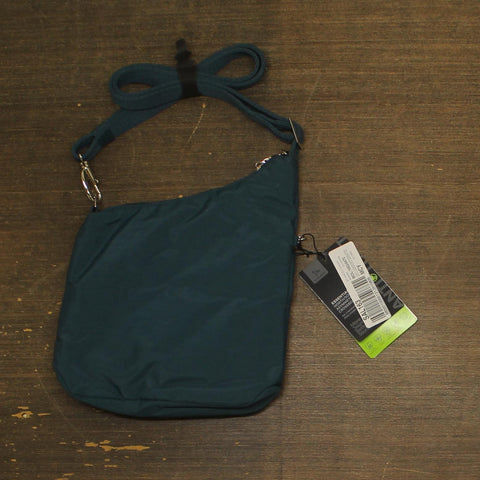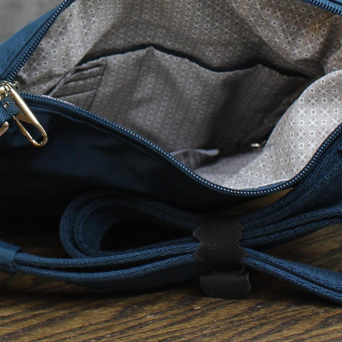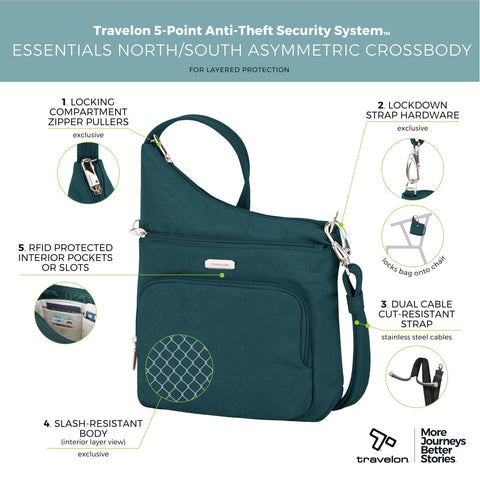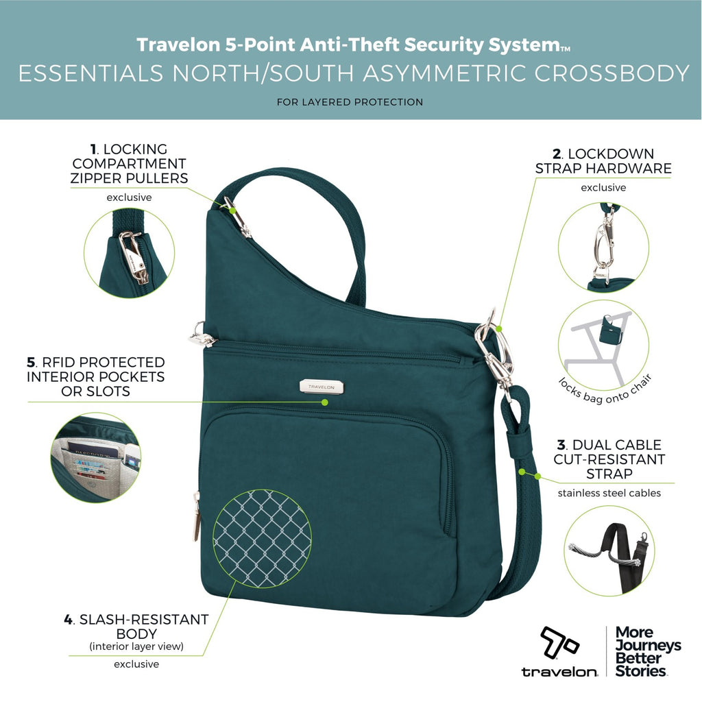 5-Point Anti-theft security system features include slash resistant mesh body panels and straps, locking compartments, along with RFID blocking interior pockets Roomy main compartment has an organization panel, zippered pocket, and slip pocket Dual exterior pockets, one that locks for added security, the other roomy compartment has two slip pockets inside to drop quick grab items into. Adjustable soft webbing shoulder strap and Tethered key clip Product