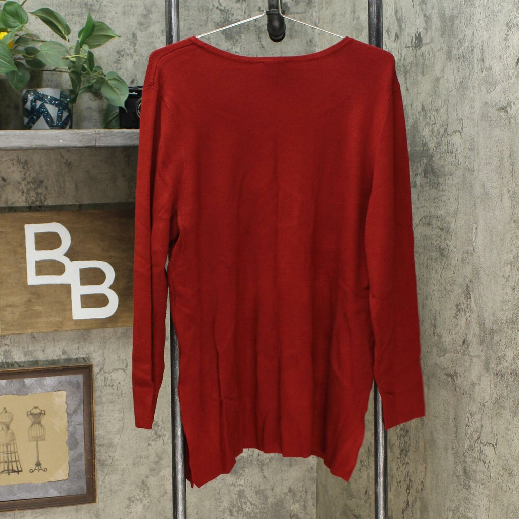 Features: pullover style, V-neckline, long sleeves, side slits, straight hemline