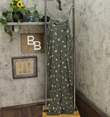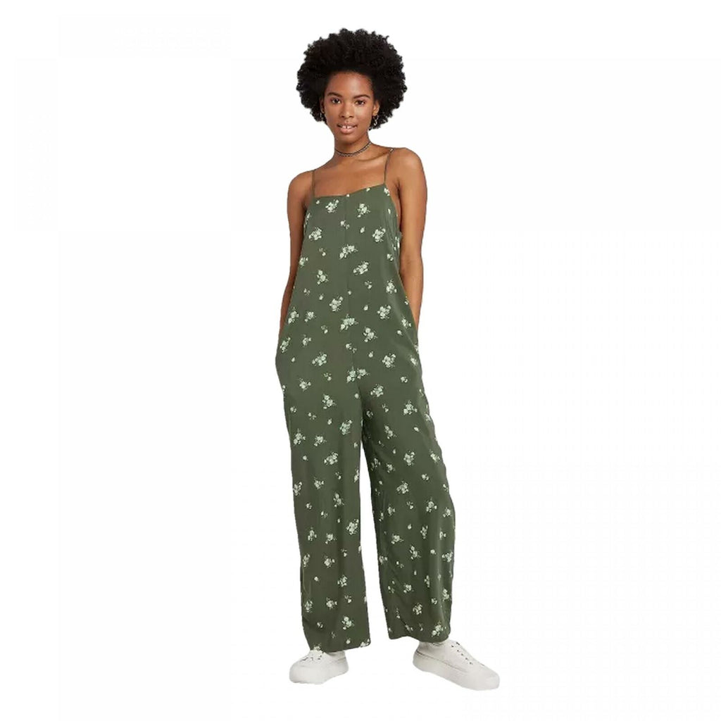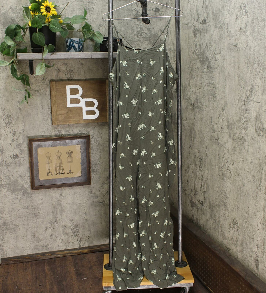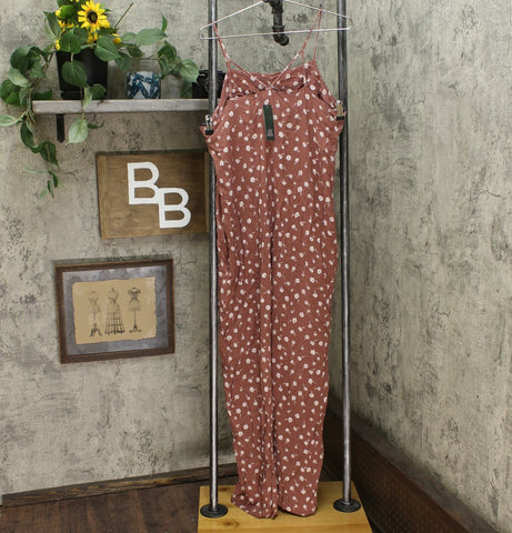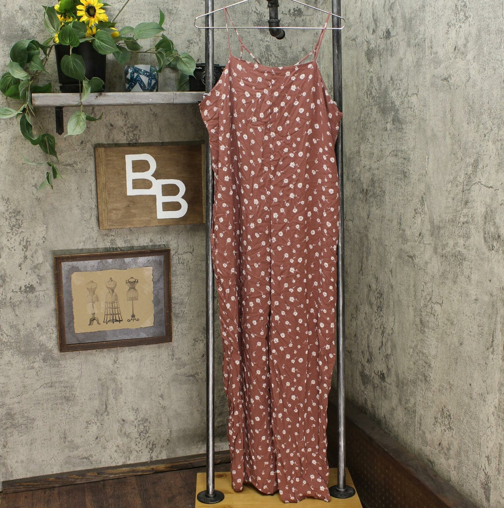 Women's floral-print jumpsuit features a waistless design for a relaxed silhouette. Center seam adds a touch of definition down the bodice, and a strappy back lends extra detail.