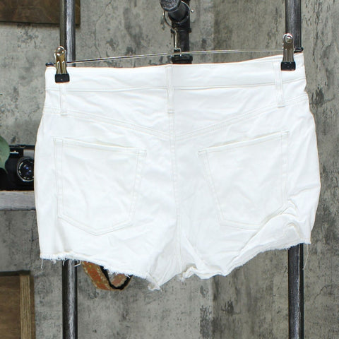 High-waisted jean shorts feature a raw-edge hem. Back and side pockets lend functional flair along with belt loops. Cotton blend offers breathability while front zipper makes for easy wear.