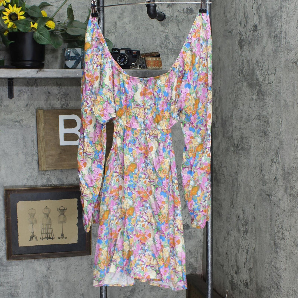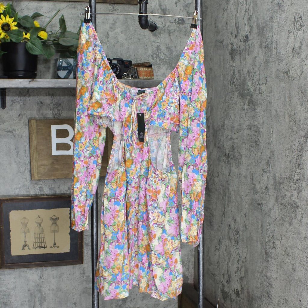 Mini dress with a fit-and-flare silhouette and puff long sleeves with elastic-cinched wrists. Scoop neckline with shirring and string ties at the front. Made of a soft and flowy fabric blend for comfortable wear. Cut-out accents at the sides complete the design with a peek-a-boo effect. Wild Fable: A look for every story.