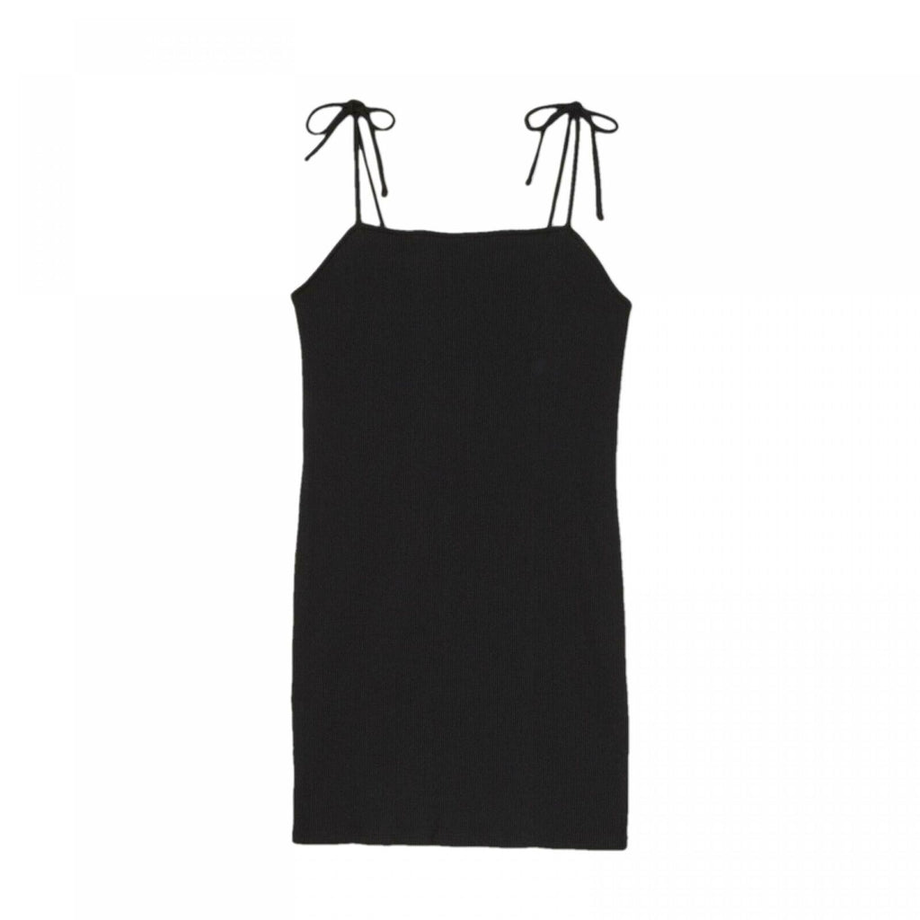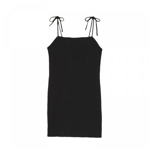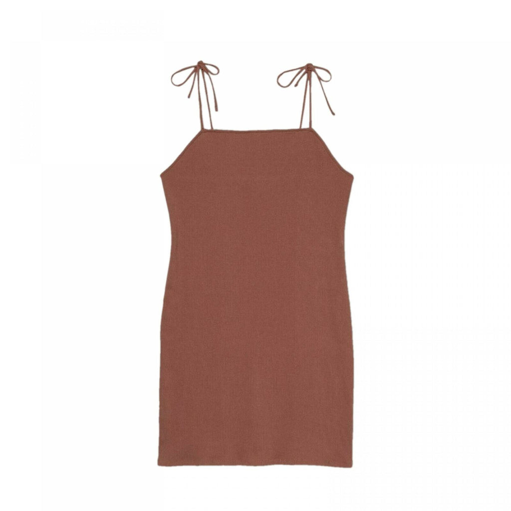 Sleeveless knit dress made from a soft, lightweight fabric for comfortable wear. Cut in a mini silhouette with a rib-knit finish for added texture and definition. Adjustable tie straps let you find a secure fit, and a square neckline completes the look.