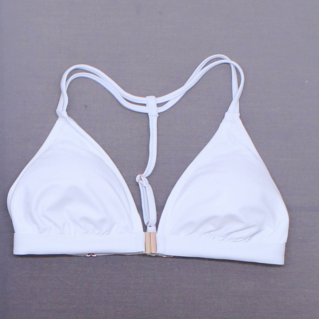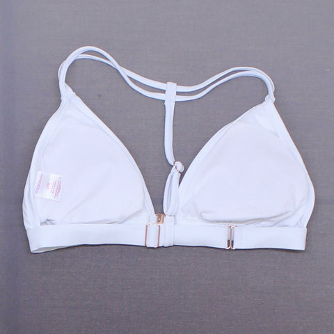 You'll be ready for any fun day spent in the sun with this White Clasp-Front Triangle Bikini Top from Xhilaration. This triangle bikini top features an adjustable bust strap and shoulder straps, and it attaches in the front with the clasp. Removable cups let you customize your fit every time, and it comes in a solid white color that makes it easy to mix and match with a variety of bikini bottoms.