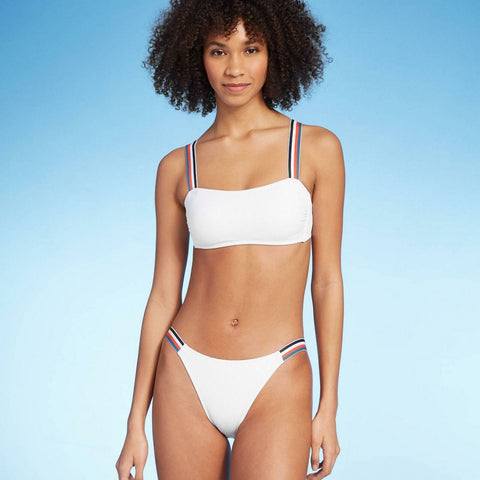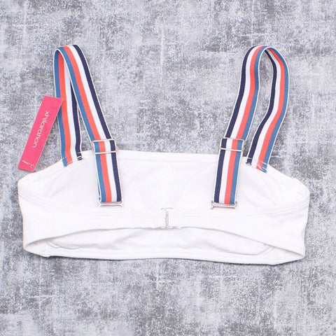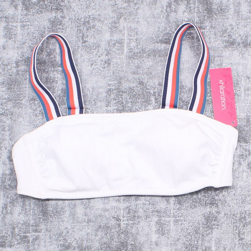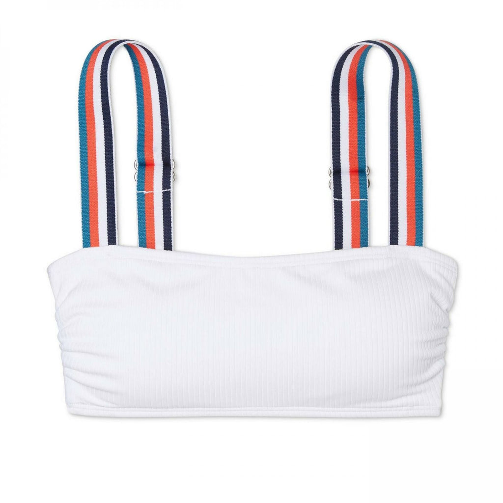 This summer, show off your sporty style beachside with the Rib-Knit Bralette Bikini Top from Xhilaration. In solid white for a bright, tidy look, this bikini top has a rib-knit construction for a touch of subtle texture, and it's finished with wide straps adorned with orange, white, navy and aqua stripes for a pop of patterned appeal. A bralette cut lends a straightforward look, while removable soft cups let you customize the top for fit and style. Pair it with matching Xhilaration bottoms for a cohesive look, or mix it up with bottoms in a coordinating solid color to add some of your own personal style.