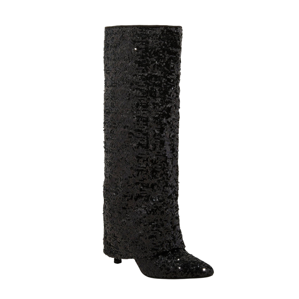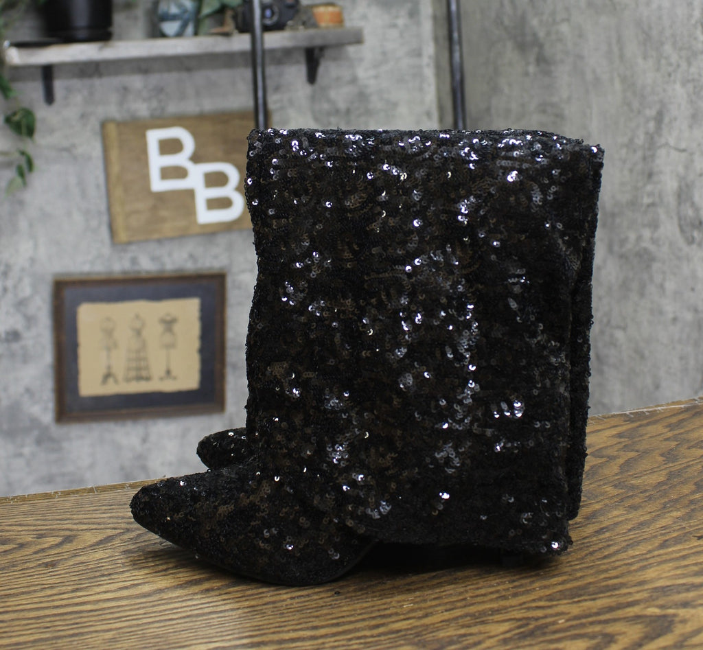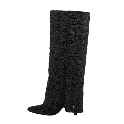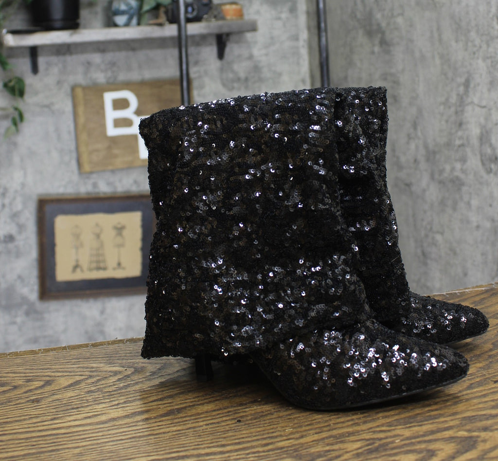 These Abba Sequin Foldover Tall Boots from A New Day are all about making a big statement on the dance floor and beyond. These black boots are covered in black sequins and designed with a pointed closed toe and a 15-inch knee-high silhouette. Set on a 3.25-inch stiletto heel, the foldover boots feature a side zipper fastening for a secure, snug fit. Pair them with shorts, a mini skirt or a midi dress for a standout look.A New Day: Style that goes wherever you do. Black foldover tall boots Embellished with black sequins 3.25in stiletto heel and 15in shaft height Polyethylene insole and polyester lining Pointed closed toe Knee-high silhouette Side zipper Textured TPR outsole Sizing: Womens Care and Cleaning: Clean With Mild Detergent Footwear Lining Material: 100% Polyester Construction: Backless Footwear Insole Material: 100% Polyurethane Features: Zipper Height Type: Knee Toe Style: Pointed Toe Footwear Upper Material: 100% Polyurethane Footwear Outsole Material: 100% TPR (Thermoplastic Rubber) Heel: Approximately 3.25 Inches Stiletto Heel Boot Shaft Circumference: Approximately 15.0 Inches Boot Shaft Height: Approximately 15.0 Inches Shoe Width: Medium Footwear toe openness: Closed Toe Footwear outsole details: Textured Outsole