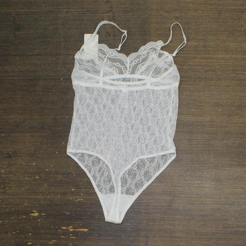 Allover lace thong-back bodysuit Back adjustable straps provide a customized fit Cotton gusset