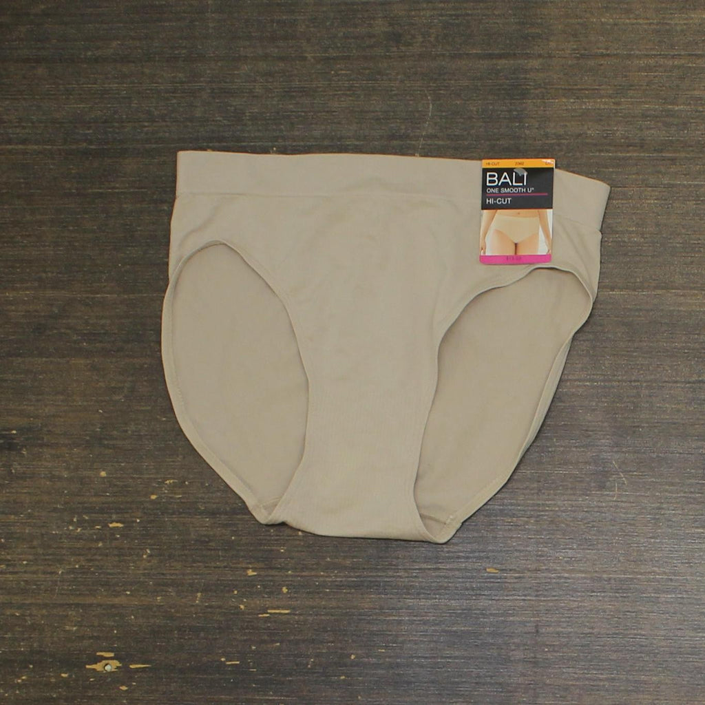 Bring seamless style to your everyday wardrobe with this Bali One Smooth U All Around Smoothing High-Cut Panty. Nearly seamless panty in a smooth and stretchy nylon and spandex fabrication. Mid rise. Stretch waistband. High-cut leg.