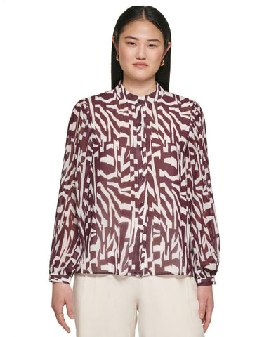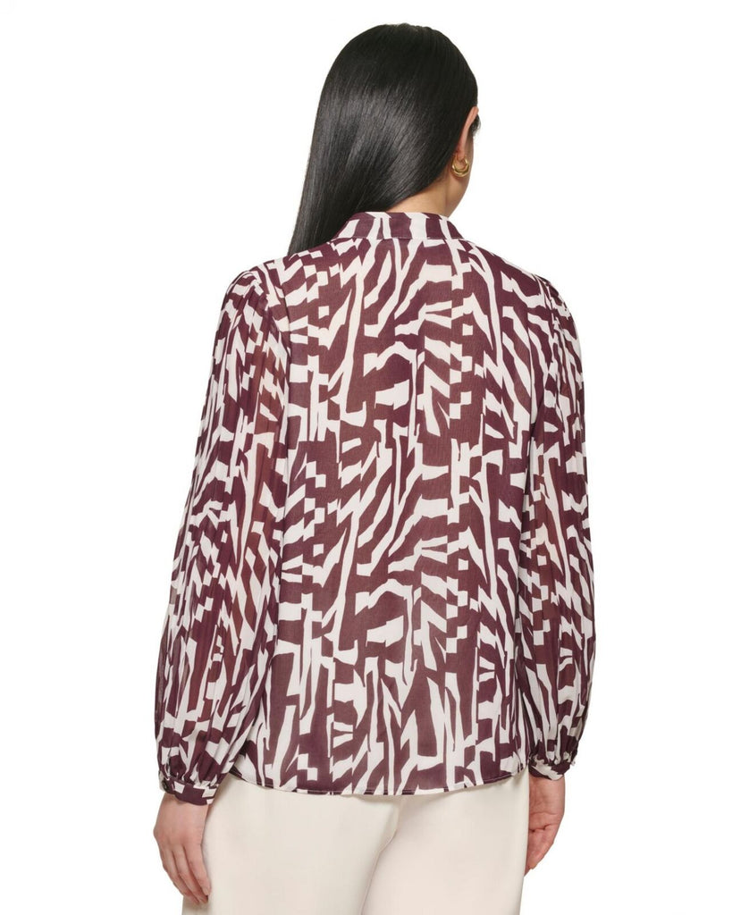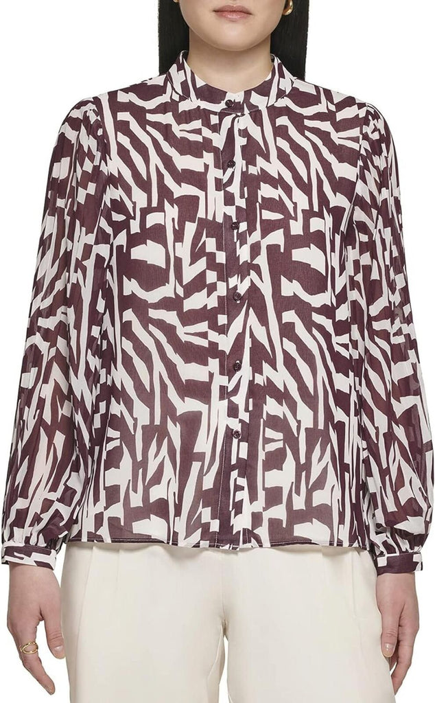 Calvin Klein Printed Pleat Sleeve Long Sleeve top. Crew neckline and long blouson sleeves with pleated detailing. Allover unique print detailing. Full button-down closure. 100% polyester. Machine wash, line dry. Imported