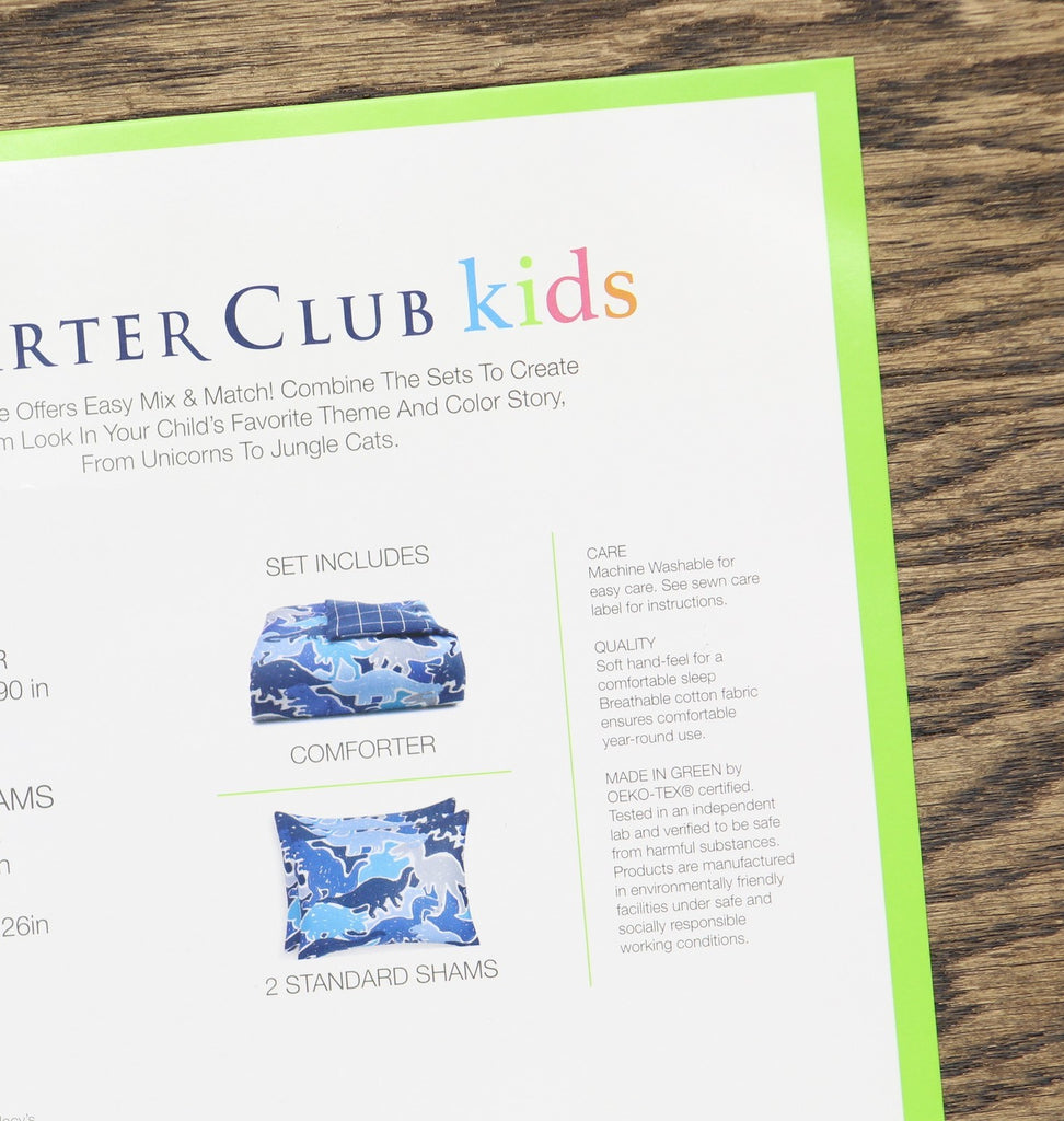 Add fun to any bedroom with the Dino Camo comforter set from Charter Club Kids, featuring a dinosaur and camouflage print. Features Set includes: comforter (90" x 90"), two shams (20" x 26") Thread count: 250, reverses to 144 Sateen face reverses to percale finish MADE IN GREEN by OEKO-TEX: Tested for harmful substances and produced sustainably [M21L9X8P0 | HOHENSTEIN HTTI] Fabric: cotton; thread count: 250, reverses to 144; polyester fill (comforter) Machine washable Imported