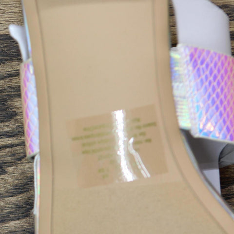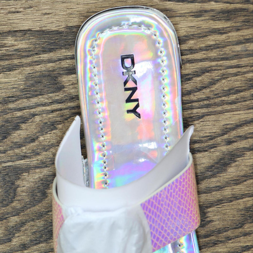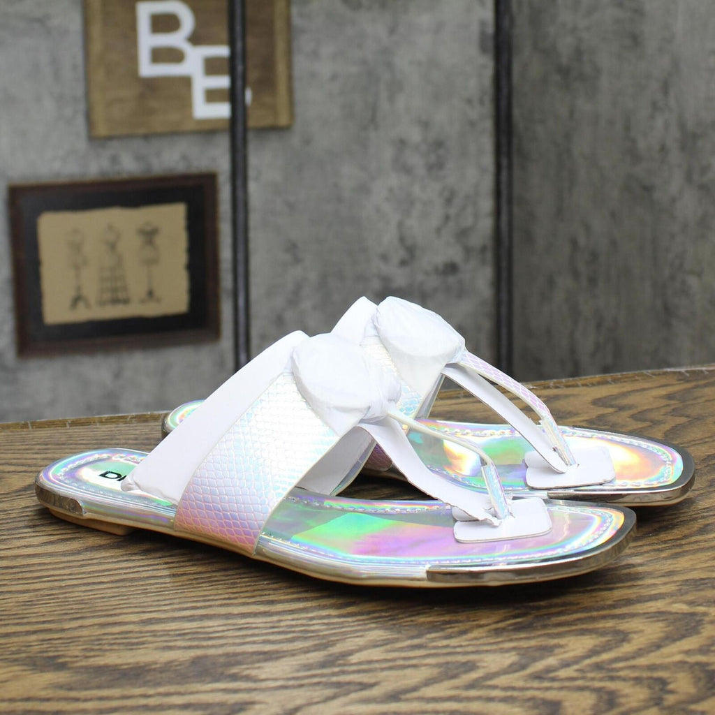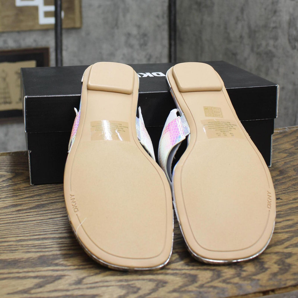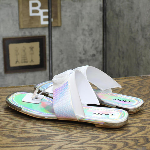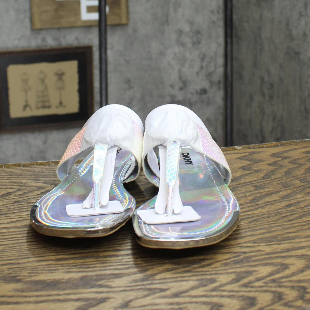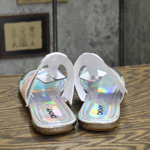 Slip on thong sandal, metal toe rand, leather uppder, double 'D' metal logo, synthetic lining