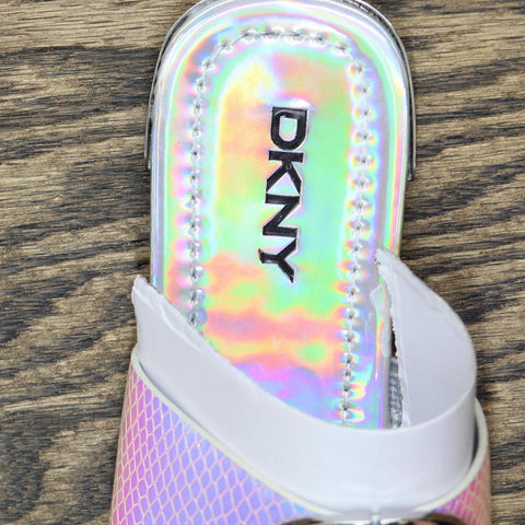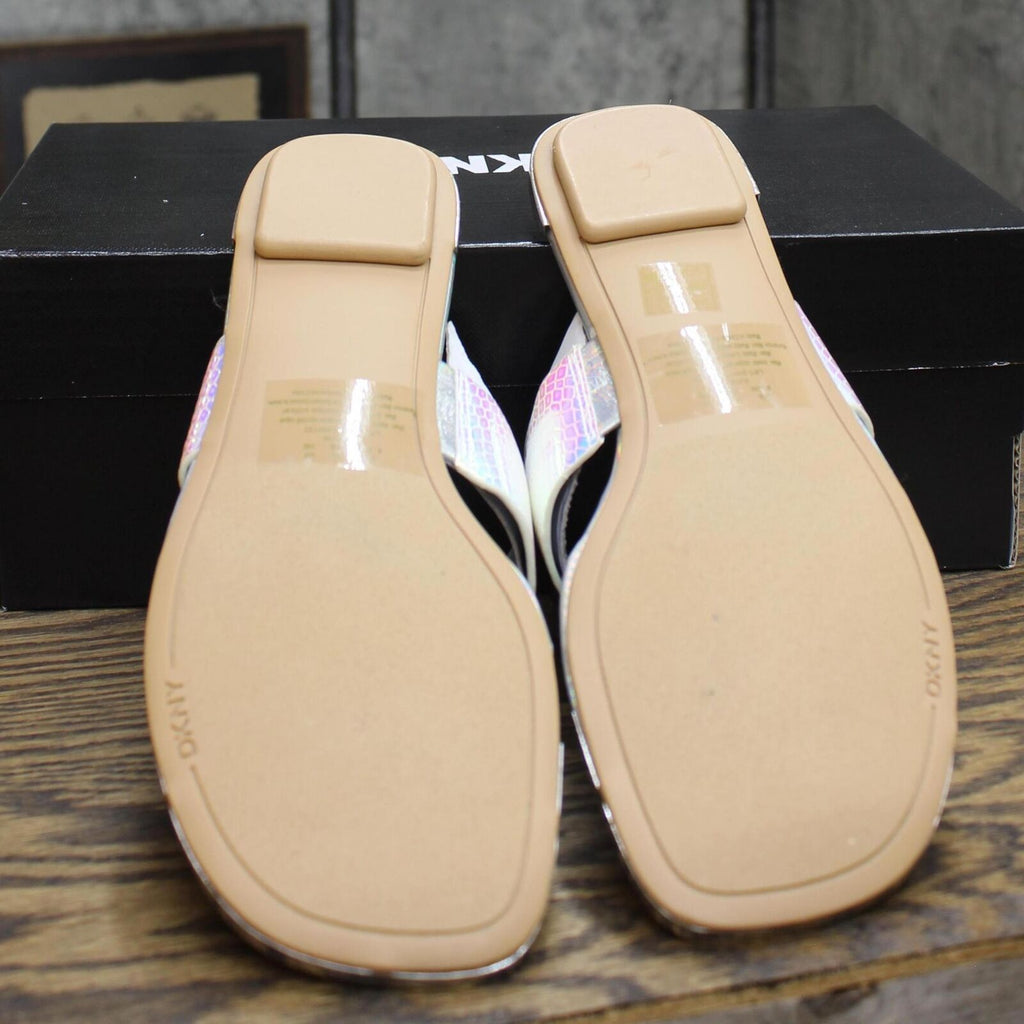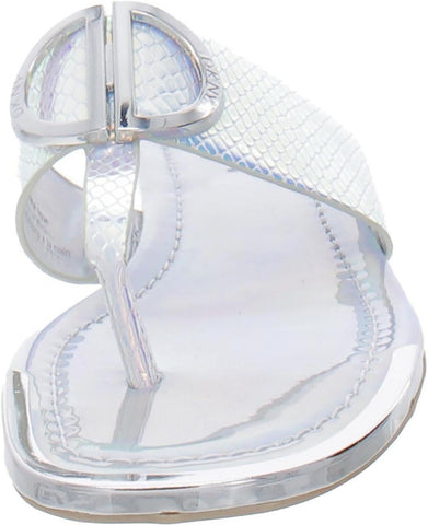 Slip on thong sandal, metal toe rand, leather uppder, double 'D' metal logo, synthetic lining