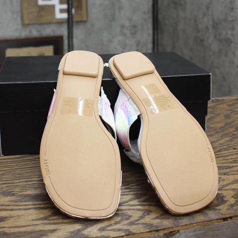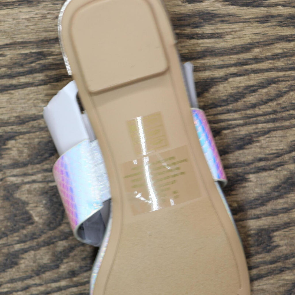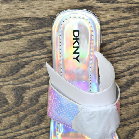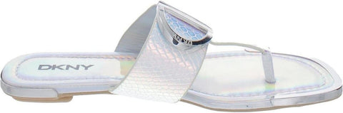 Slip on thong sandal, metal toe rand, leather uppder, double 'D' metal logo, synthetic lining
