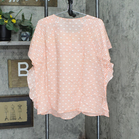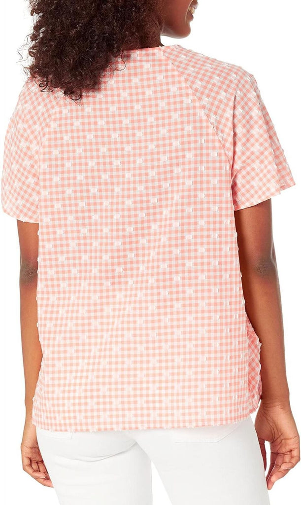 This sweet gingham dot shirt deserves a scoop of sorbet. Its carefree cut with raglan sleeves, slightly-frivolous ruffle details and fun shoulder buttons indulges the sugar and spice inside you