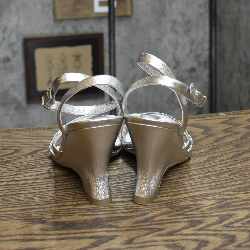Express your artful sense of style in this stunning, strappy, dress wedge sandal with a unique scultpted heel and ankle strap. Half size up reccomended.