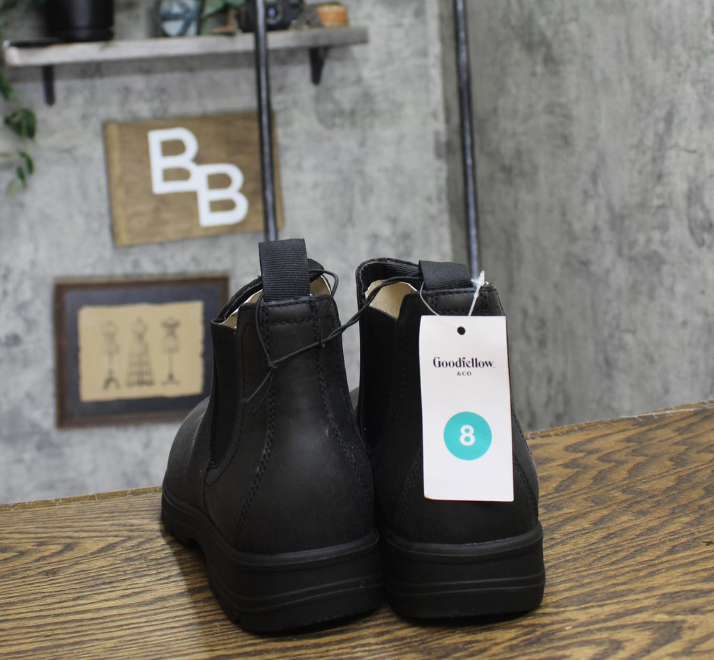 These Huxley Chelsea Boots from Goodfellow & Co are a perfect addition to your shoe wardrobe. The faux-leather design features a solid-color upper with a round closed toe, cushioned insole and medium width. Set on a TPR outsole, these mid-calf boots are equipped with distinct elastic panels on the sides, along with front and back pull tabs for a snug, secure fit. Experiment with different clothing combinations to showcase your unique style and make these Chelsea boots a versatile staple in your collection.Goodfellow & Co: Feel good in what you wear, anywhere. Faux-leather Chelsea boots in solid shade 4.5in shaft height Cushioned insole and polyester lining Closed round toe Elastic gores and pull tabs TPR outsole Sizing: Mens Construction: Cushioned Insole Footwear Insole Material: 100% Polyester Features: Pull-On Care and Cleaning: Spot or Wipe Clean Footwear Lining Material: 100% Polyester Fabric Name: Faux Leather Toe Style: Round Toe Height Type: Mid Calf Footwear Upper Material: 100% Polyurethane Heel: No Heel Footwear Outsole Material: 100% TPR (Thermoplastic Rubber) Boot Shaft Circumference: Approximately 11.0 Inches Boot Shaft Height: Approximately 4.5 Inches Shoe Width: Medium Footwear toe openness: Closed Toe Footwear outsole details: Non Marking Outsole Boot shaft width: Medium Calf Battery: No Battery Used