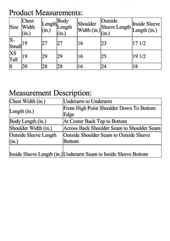 Size Chest Width (in.) Length (in.) Body Length (in.) Shoulder Width (in.) Outside Sleeve Length (in.) Inside Sleeve Length (in.)