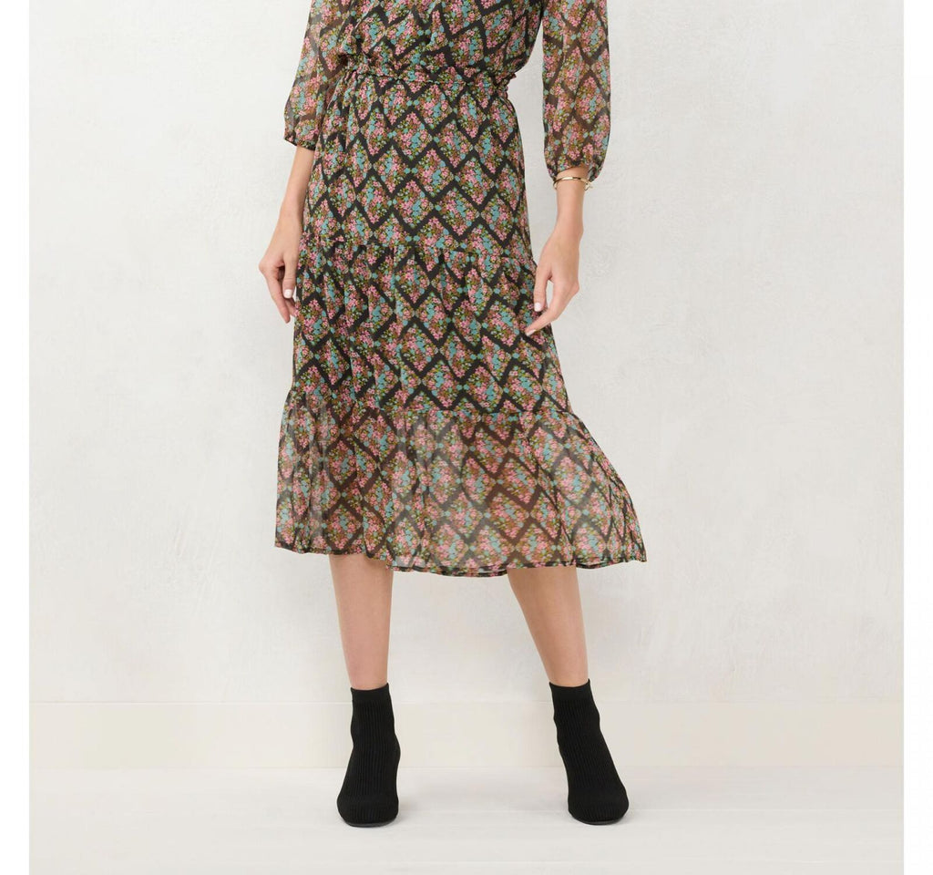 A cute pick! This women's midi skirt from LC Lauren Conrad is the perfect wardrobe essential. A cute pick! This women's midi skirt from LC Lauren Conrad is the perfect wardrobe essential. Smocked elastic waistband Chiffon construction Tiered hemlineFIT & SIZING 32-in. length Midi silhouette Pull-on designFABRIC & CARE Polyester Lining: Polyester Machine wash Imported NA