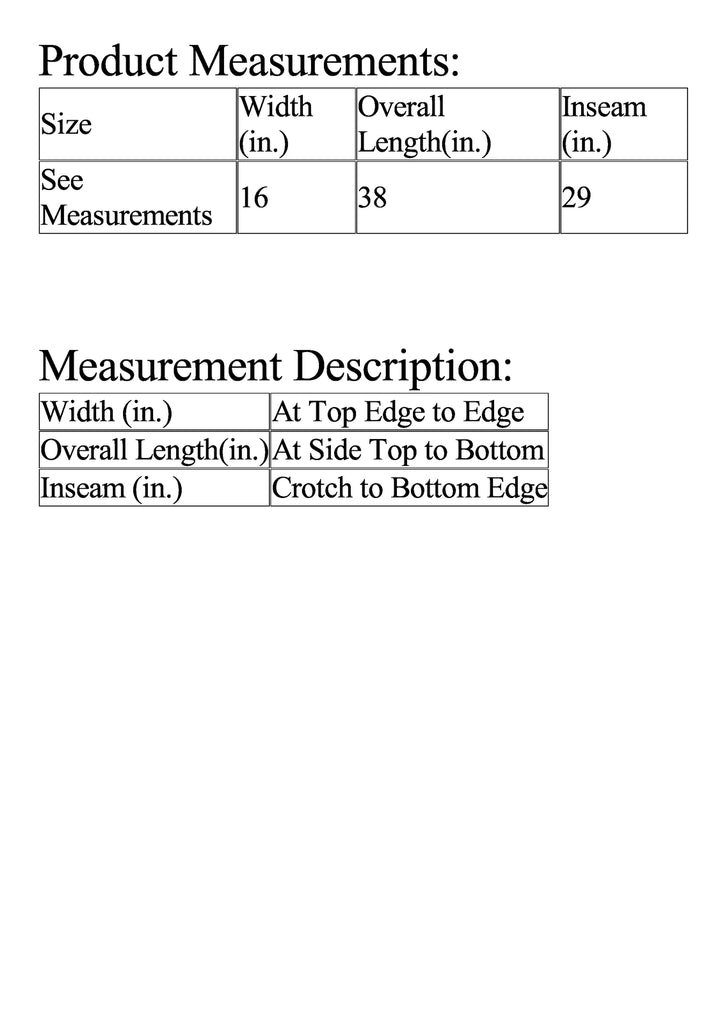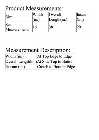| Size | Width (in.) | Overall Length(in.) | Inseam (in.) |