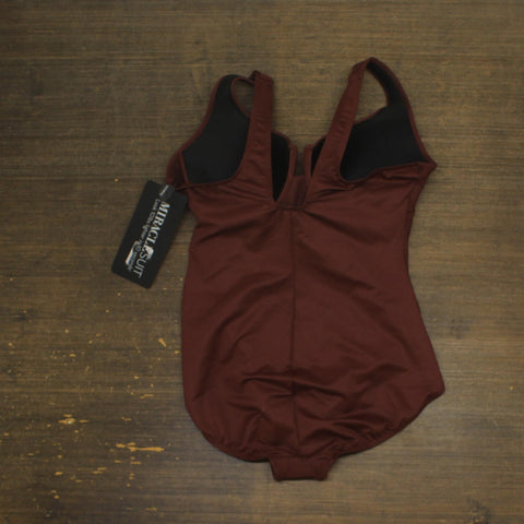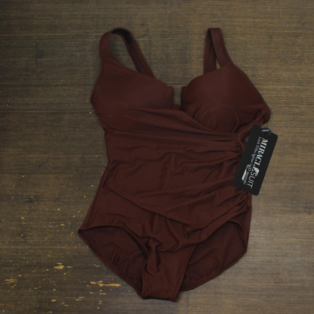 Look 10 lbs. lighter in 10 seconds with Miraclesuit Foam cups with underwire Moderate bottom coverage Maximum overall coverage, full control garment Miratex fabric provides allover body control, shapes and slims Pull-on styling; padded over-the-shoulder straps V-neck with notch Lined Cleverly draped fabric conceals tummy Nylon/spandex; drape: nylon/spandex; lining: nylon/spandex Hand wash Imported
