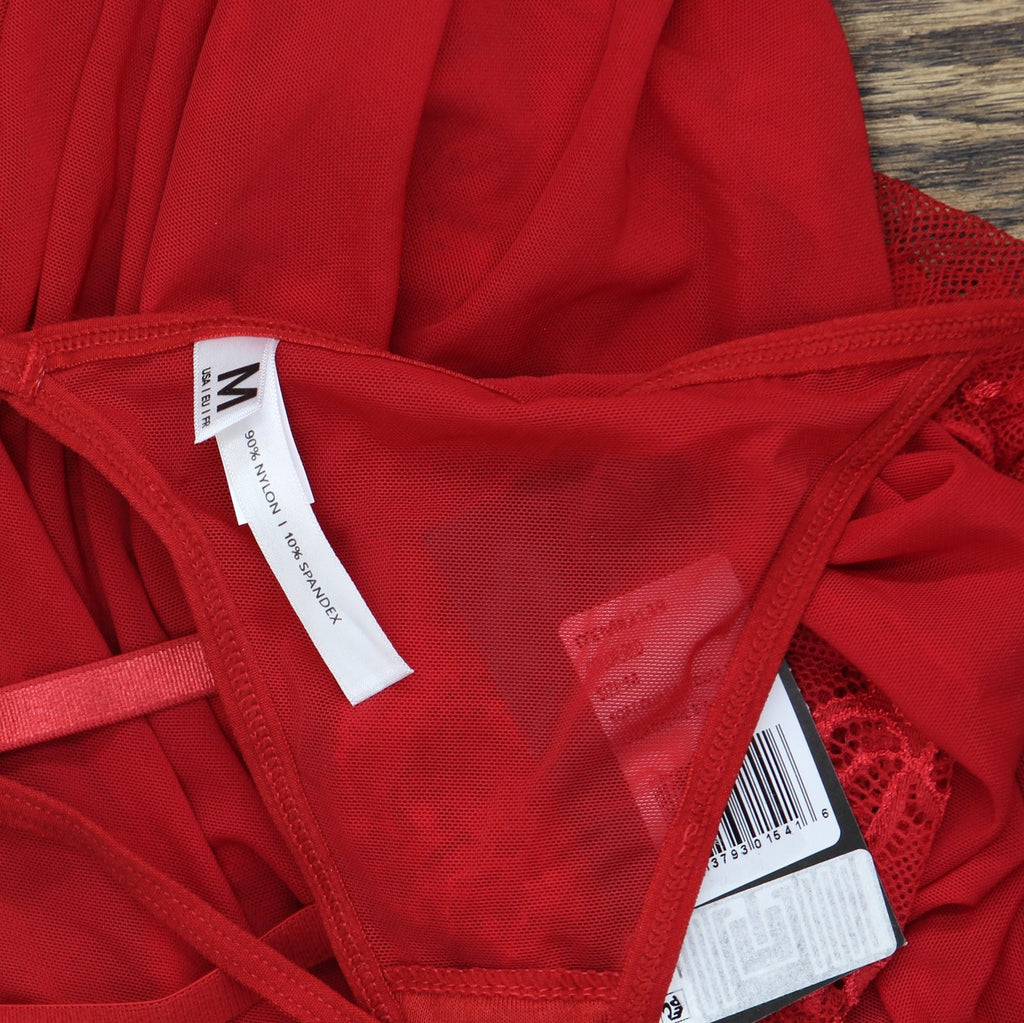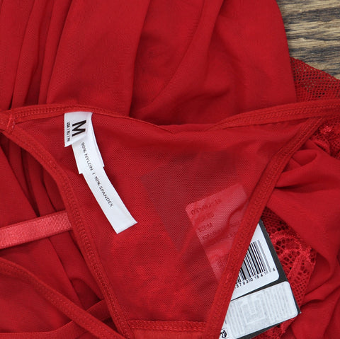 Oh La La Cheri Valentine Lace Babydoll And G-String Set (2139). Seduction and comfort can be found in this sensual babydoll made of sheer mesh and soft stretch lace. Features satin bow accents and a lace ruffle at the hem. Set includes matching stretch mesh g-string. Wireless, unlined, lace cups have center vertical seams for shape. Covered elastic along top of back for custom fit. Stretch lace hem for flirty look. Elastic straps with satin bows at bases adjust in back with coated metal hardware. Matching g-string has elastic at waist and along leg openings, and a sewn-in crotch. Perfect for sleep and lounge. Please Note: Model is wearing nipple covers for modesty. Sizes 1X-2X and 3X-4X have a tall hook-and-eye back closure with a keyhole below it.