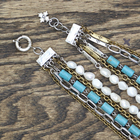 This intricately designed necklace features freshwater pearls, turquoise color magnesite stones, and multiple layers and textures. With a clasp at the end of each layer, this necklace gives you the ability to remove layers as you wish - you can wear each necklace on its own or create your own unique jewelry piece.