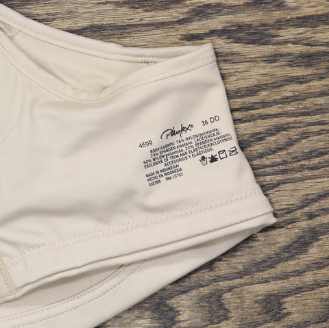 Playtex 18 Hour Bounce Control Wirefree Bra (US4699). At last an everyday bra that makes you feel supported comfortable and contained. And the pretty patterning around the neckline and straps makes you feel elegant as well! Made of nylon/spandex. Molded wireless cups are lined with breathable knit. Inner side support slings help with forward projection. Sturdy molded cups provide a custom fit for each breast. V-shaped neckline has a tonal chevron-patterned band that continues up the front straps. Neckline has covered elastic for containment of full busts. Tall center front has a straight bottom edge. Anchorstrap tech helps cancel the bounce. High sides deliver extra support and smoothing. Covered elastic underband gives additional support. Wide Comfort Cushion convertible straps may be worn straight up or crossed in back detaching with coated metal S-hooks at top edge. Kicked-in back straps help keep them on shoulders. No ride-up back has covered elastic at top edge for fit. Cool Comfort wicking knit