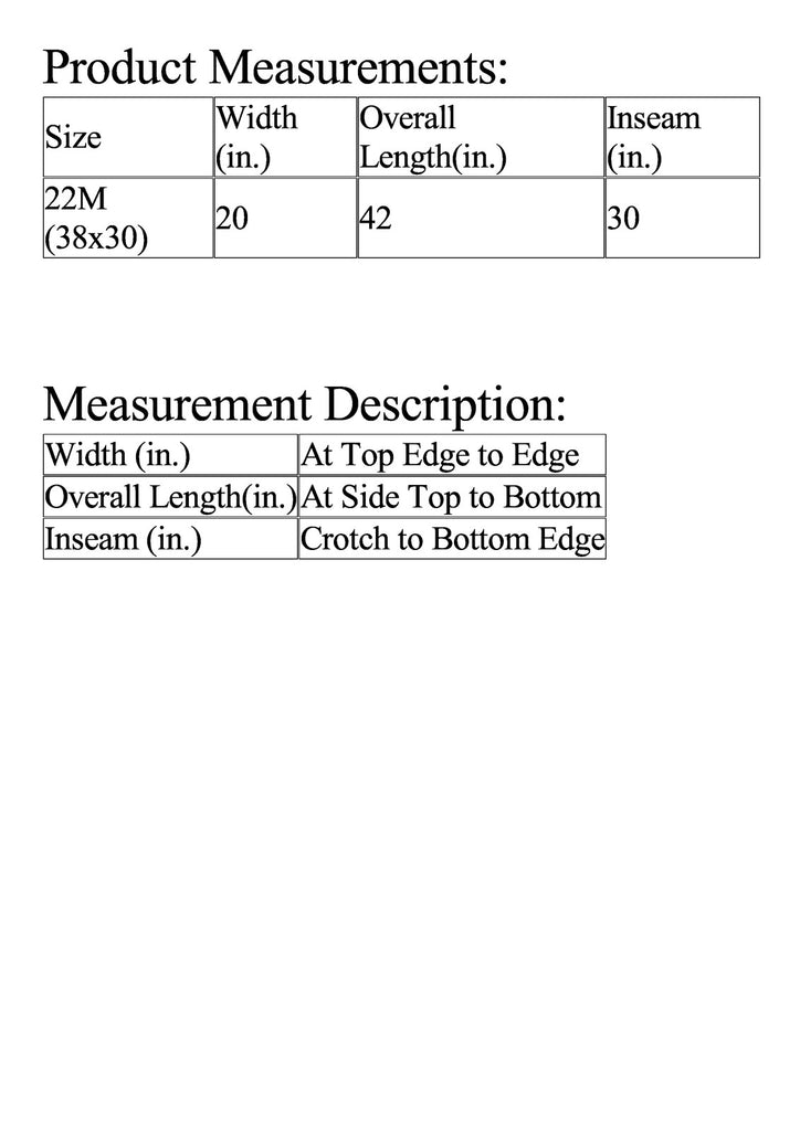 | Size | Width (in.) | Overall Length(in.) | Inseam (in.) |
