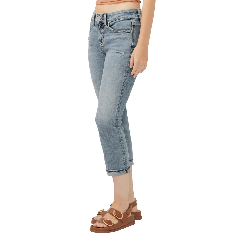 Capri leg jeans in a medium indigo wash 9.25'' mid rise 5-pocket styling with a zip fly and button closure 13.5" leg opening
