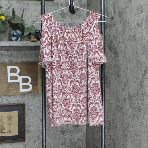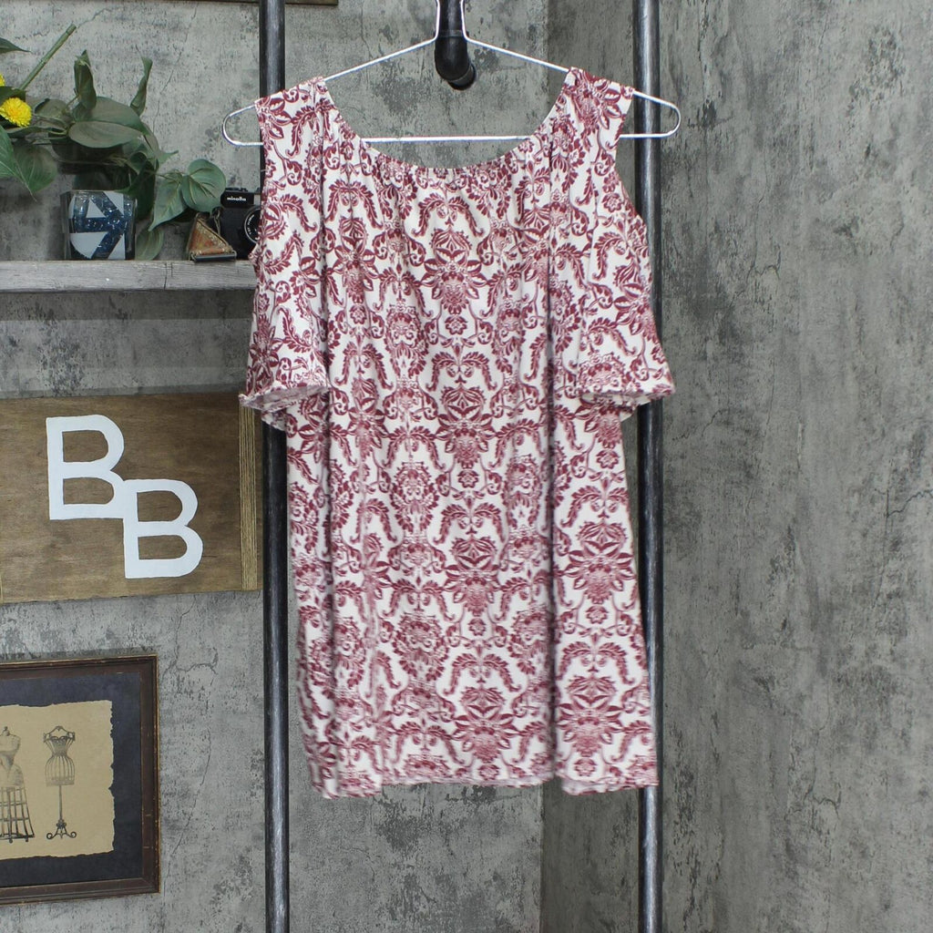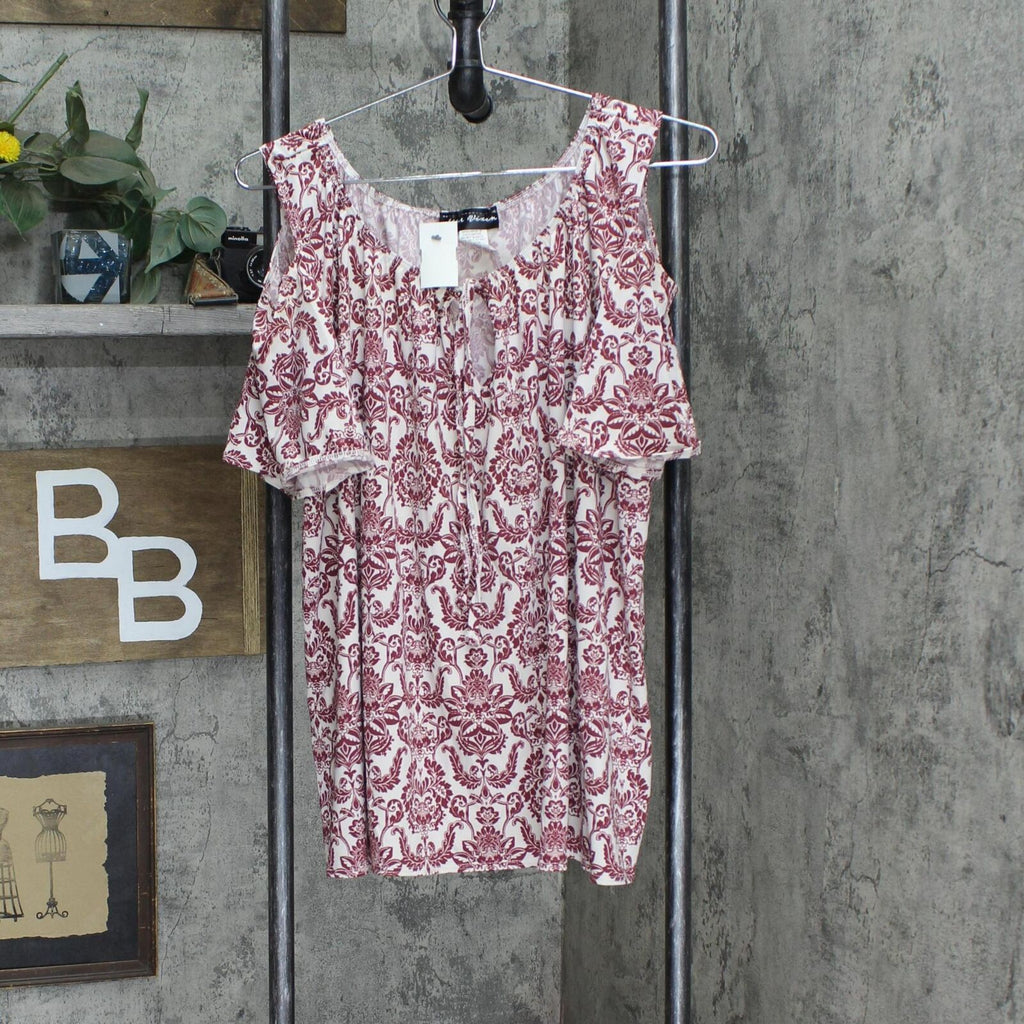Versatile and fashionable peasant top in a soft and silky, wrinkle resistant knit fabric. Travel-friendly, comfortable and flattering. Cold shoulder detail with a flutter sleeve creates a look that is easy to dress up or down. Style details include tie neck design and open hem styling. This is the perfect piece take you from work to happy hour and everywhere in between
