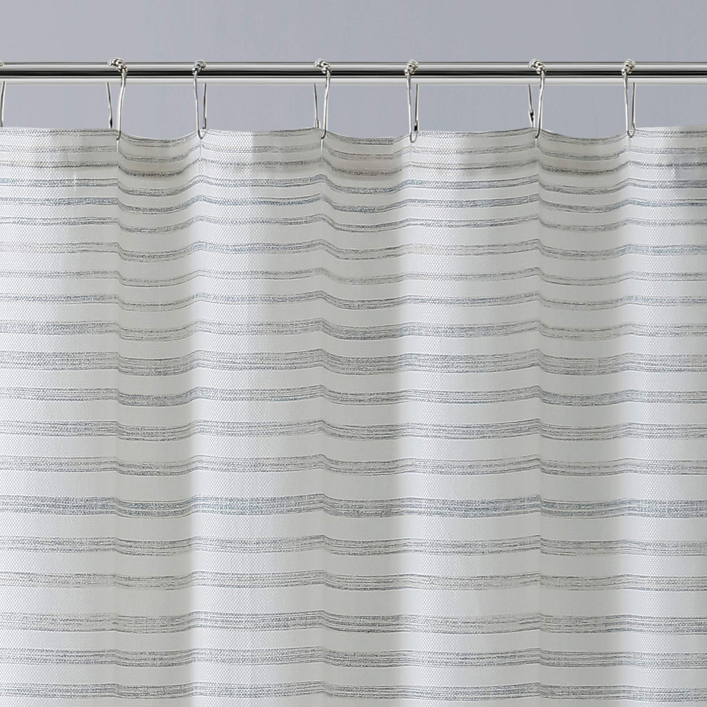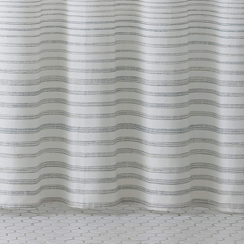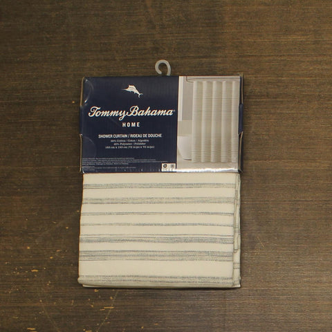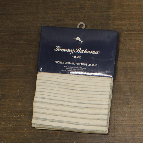 MATERIAL: Made using 60% Cotton / 40% Polyester, durable CVC microfiber. INCLUDES: 1 Shower Curtain FEATURES: Both stylish and functional, this shower curtain brings a coastal vibe that upgrades any bathroom décor with a unique design. Hooks and shower liner sold separately. DESIGN: The Tommy Bahama Tidal Stripe Stripe features blue and khaki stripes throughout. DIMENSIONS: Shower Curtain: 72" (L) x 72" (W)