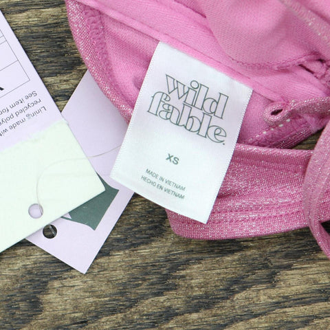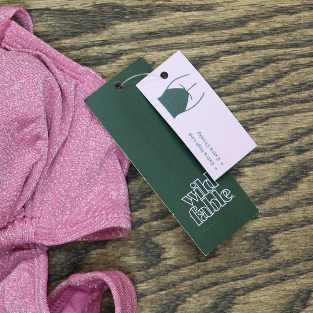Pink lurex one-piece swimsuit from Wild Fable features a keyhole front, cutout sides along with an extra-high-leg cheeky design. Stretchy fabric construction with removable cups. Crisscross back with adjustable tie provides the perfect fit. Wild Fable: A look for every story.