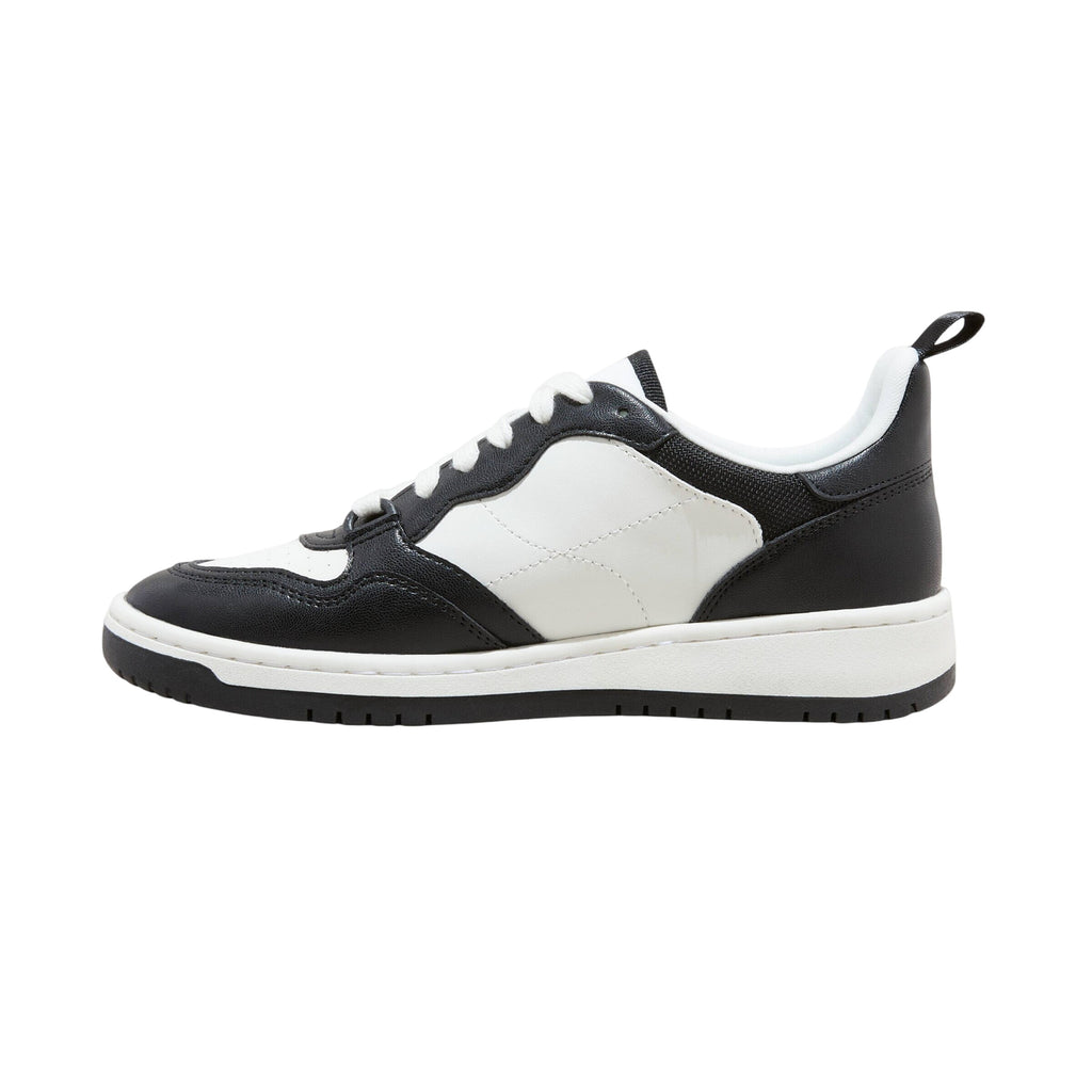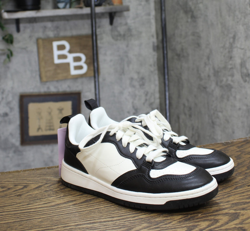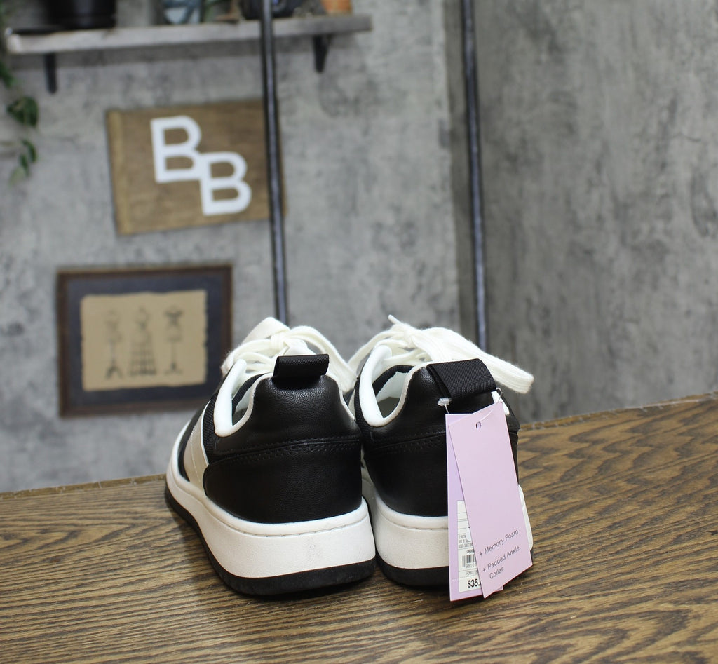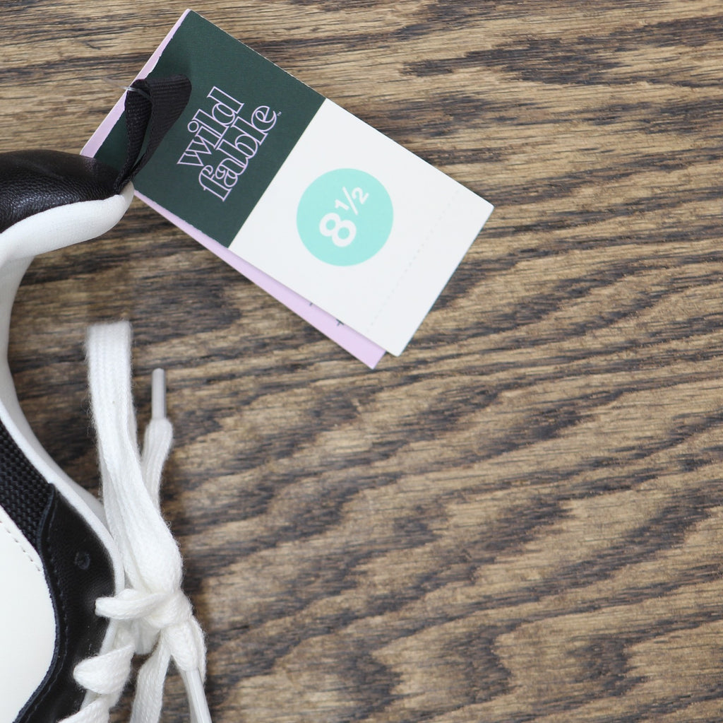 Netty fashion sneakers from Wild Fable with a faux-leather upper featuring a stylish two-tone paneled design. Feature a lace-up front and a low-top back with a pull tab loop. Medium-shoe width with memory foam footbed to keep your feet comfy all day. Low-top sneakers with faux-leather upper Lace-up front Memory foam insole Round toe and medium shoe width Textured outsole Sizing: Womens Construction: Memory Foam Insole Footwear Insole Material: 100% Polyurethane Features: Lace Up Care and Cleaning: Clean With Mild Detergent Footwear Lining Material: 100% Polyester Fabric Name: Faux Leather Toe Style: Round Toe Height Type: Low Top Footwear Upper Material: 95% Polyurethane and 4% Polyester and 1% Zinc Alloy Heel: No Heel Footwear Outsole Material: 58% Leather and 42% TPR (Thermoplastic Rubber) Shoe Width: Medium Footwear toe openness: Closed Toe Footwear outsole details: Textured Outsole Battery: No Battery Used