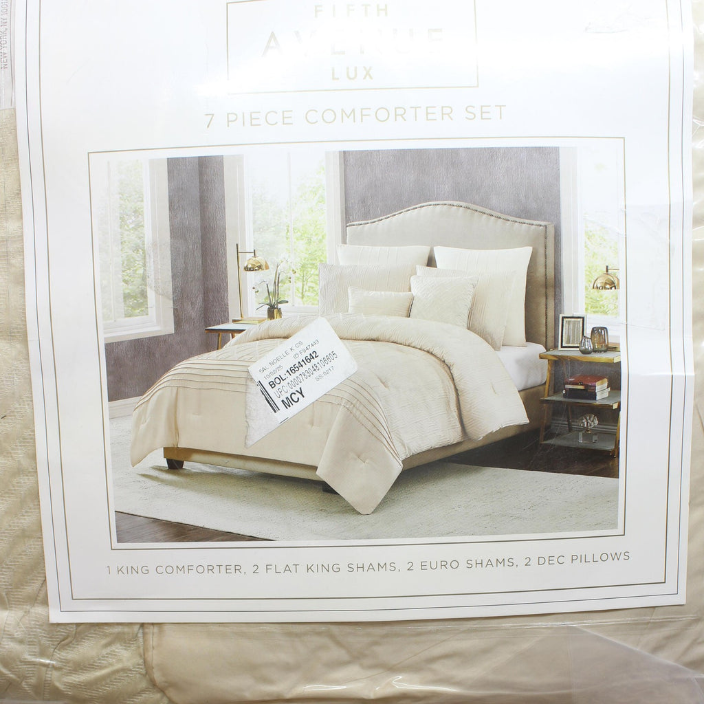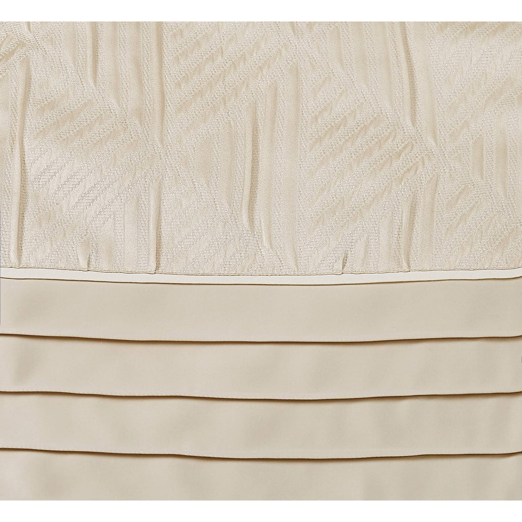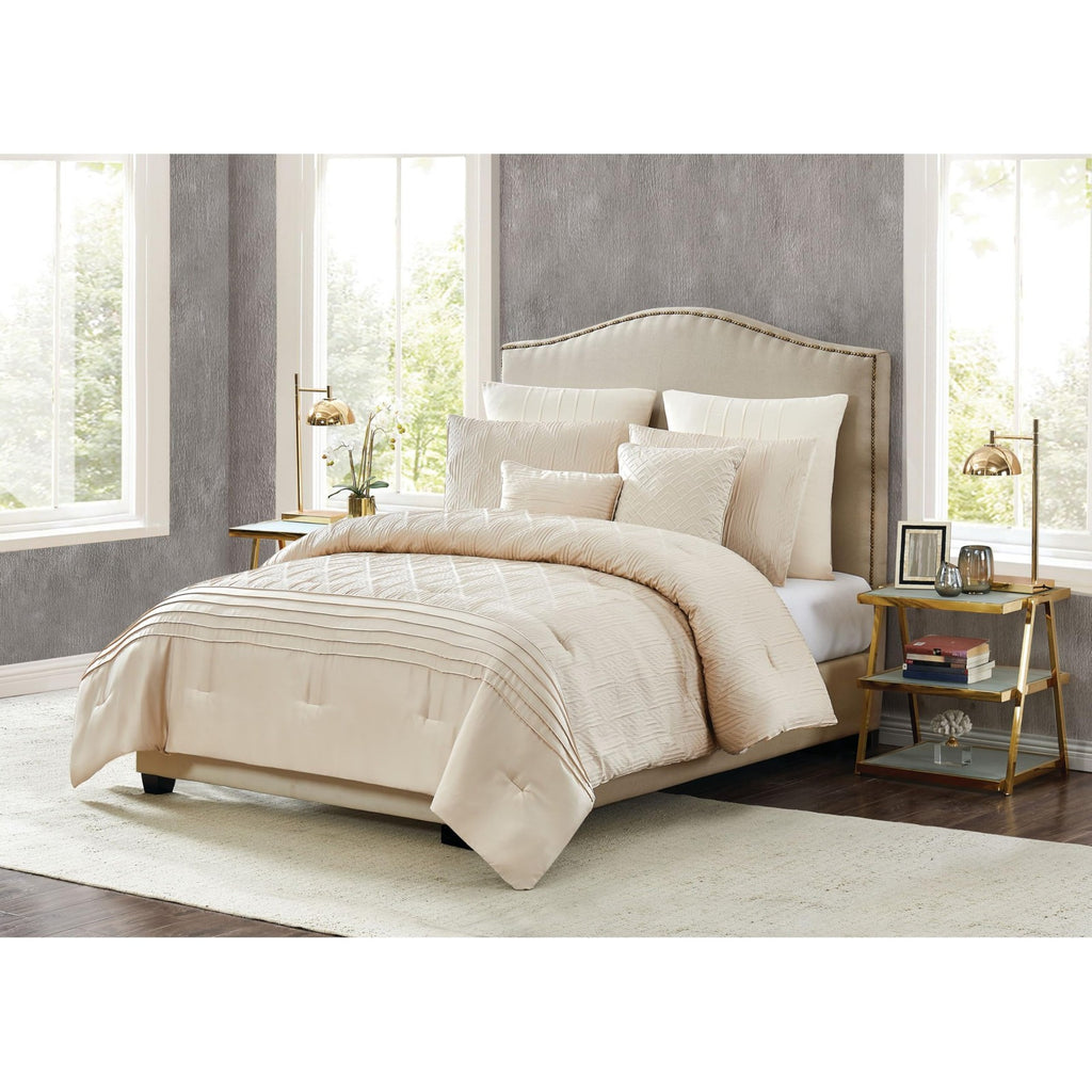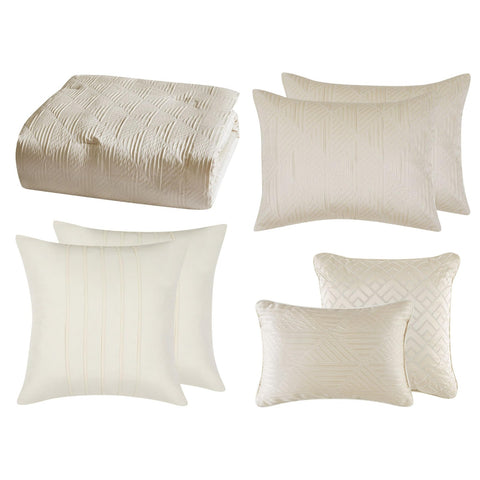 This detailed bed uses subtle ivory tones with pieced fabrics to bring a luxurious look to your bedroom. The comforter face features a geometric pattern jacquard woven fabric in the body which is framed at the foot with a hotel style look. The ensemble is completed with decorative pillows to complete the look of the bed. Face is 100% polyester fabrics which are pieced with jacquard and embroidered highlights. The comforter is filled with100% polyester filling. Comforter is machine washable, but please refer to the care labels on individual items included in the set. Includes: one king comforter 104x90 inches, two king shams 20x36 inches, two european shams 26x26 inches and two decorative pillows 12x18 and 18x18 inches. Number of Pieces: 7 Piece 1: Comforter: 104 Inches (L) x 90 Inches (W), Quantity 1 Piece 2: Pillow Sham: 20 Inches (L) x 36 Inches (W), Quantity 2 Piece 3: Pillow Sham: 26 Inches (L) x 26 Inches (W), Quantity 2 Piece 4: Decorative Pillow: 12 Inches (L) x 18 Inches (W), Quantity 1 Piece 5: Decorative Pillow: 18 Inches (L) x 18 Inches (W), Quantity 1 Closure Type: Pillow Sham: French-Flat Closures Fill Material: 100% Polyester Fabric Name: Woven Textile Material: 100% Polyester Style: Comforter Bedding Sets Sheet Features: Pleated, Embroidered Details Backing Material: 100% Polyester Includes: 2 Decorative Pillows, 2 Euro Shams, Comforter, 2 Shams Thread Count: 180 Fabric Weight Type: Year Round Fabric Construction Care and Cleaning: Machine Wash, Tumble Dry