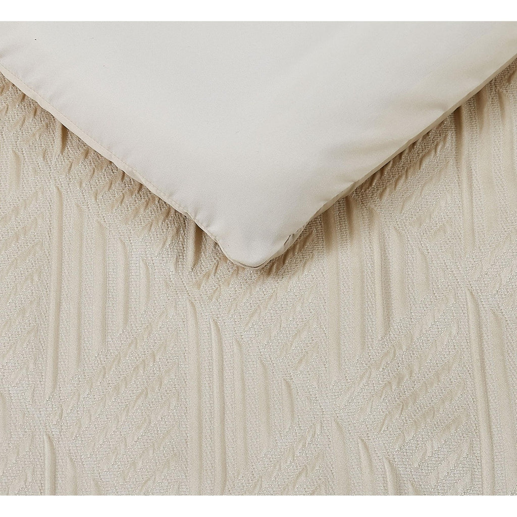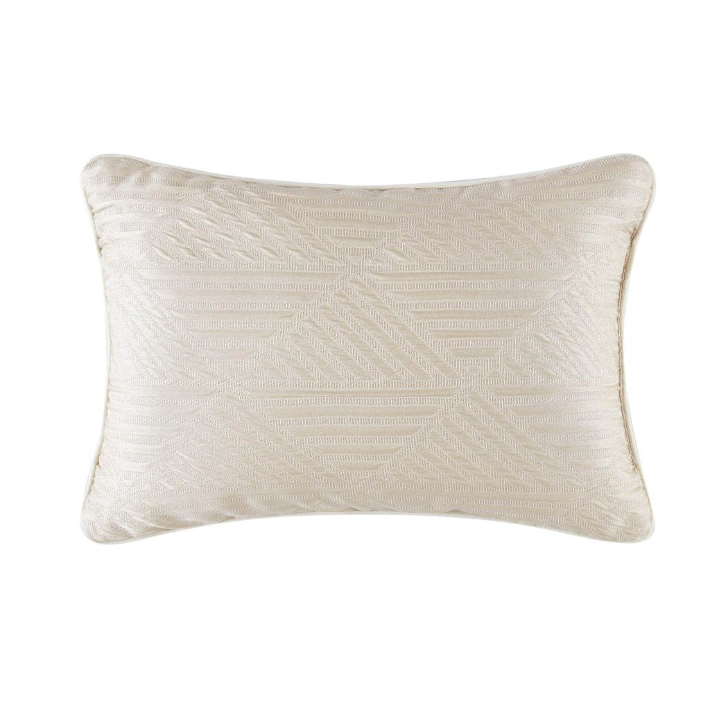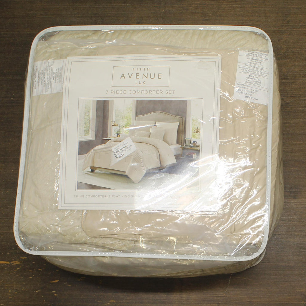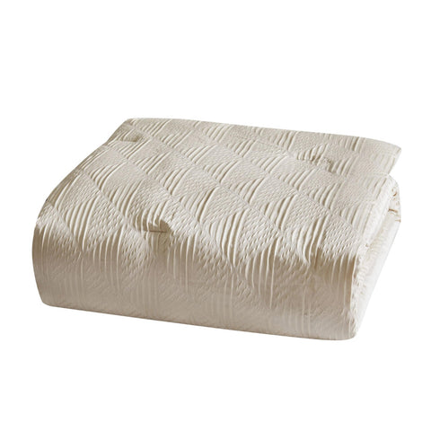 This detailed bed uses subtle ivory tones with pieced fabrics to bring a luxurious look to your bedroom. The comforter face features a geometric pattern jacquard woven fabric in the body which is framed at the foot with a hotel style look. The ensemble is completed with decorative pillows to complete the look of the bed. Face is 100% polyester fabrics which are pieced with jacquard and embroidered highlights. The comforter is filled with100% polyester filling. Comforter is machine washable, but please refer to the care labels on individual items included in the set. Includes: one king comforter 104x90 inches, two king shams 20x36 inches, two european shams 26x26 inches and two decorative pillows 12x18 and 18x18 inches. Number of Pieces: 7 Piece 1: Comforter: 104 Inches (L) x 90 Inches (W), Quantity 1 Piece 2: Pillow Sham: 20 Inches (L) x 36 Inches (W), Quantity 2 Piece 3: Pillow Sham: 26 Inches (L) x 26 Inches (W), Quantity 2 Piece 4: Decorative Pillow: 12 Inches (L) x 18 Inches (W), Quantity 1 Piece 5: Decorative Pillow: 18 Inches (L) x 18 Inches (W), Quantity 1 Closure Type: Pillow Sham: French-Flat Closures Fill Material: 100% Polyester Fabric Name: Woven Textile Material: 100% Polyester Style: Comforter Bedding Sets Sheet Features: Pleated, Embroidered Details Backing Material: 100% Polyester Includes: 2 Decorative Pillows, 2 Euro Shams, Comforter, 2 Shams Thread Count: 180 Fabric Weight Type: Year Round Fabric Construction Care and Cleaning: Machine Wash, Tumble Dry
