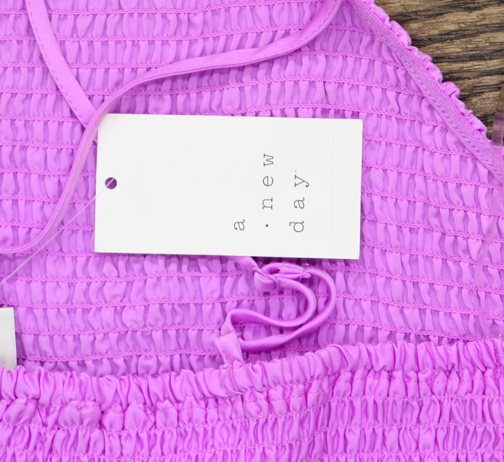 Elevate your warm-weather outfits with this Apron Tank Top from A New Day. Fashioned in a cropped length, this sleeveless tank top features a halter neck, a smocked construction and a crisscross back with adjustable straps for a customizable fit. The lightweight satin fabric offers all day comfort, while the pullover style makes for easy wear. Pair this top with high-waisted jeans, shorts or skirts for a variety of stylish ensembles.A New Day: Style that goes wherever you do. Smocked apron tank top in solid hue Lightweight satin fabric Cropped length Adjustable spaghetti straps Pullover style Recycled polyester Sizing: Womens Material: 100% Recycled Polyester Length: At Waist Garment Style: Sleeveless, Pullover Fit: Standard Fit Neckline: Halter Fabric Name: Satin Garment Details: Adjustable Strap Fabric Weight Type: Lightweight Fabric Garment sleeve style: Spaghetti Straps Care and Cleaning: Machine Wash, Tumble Dry