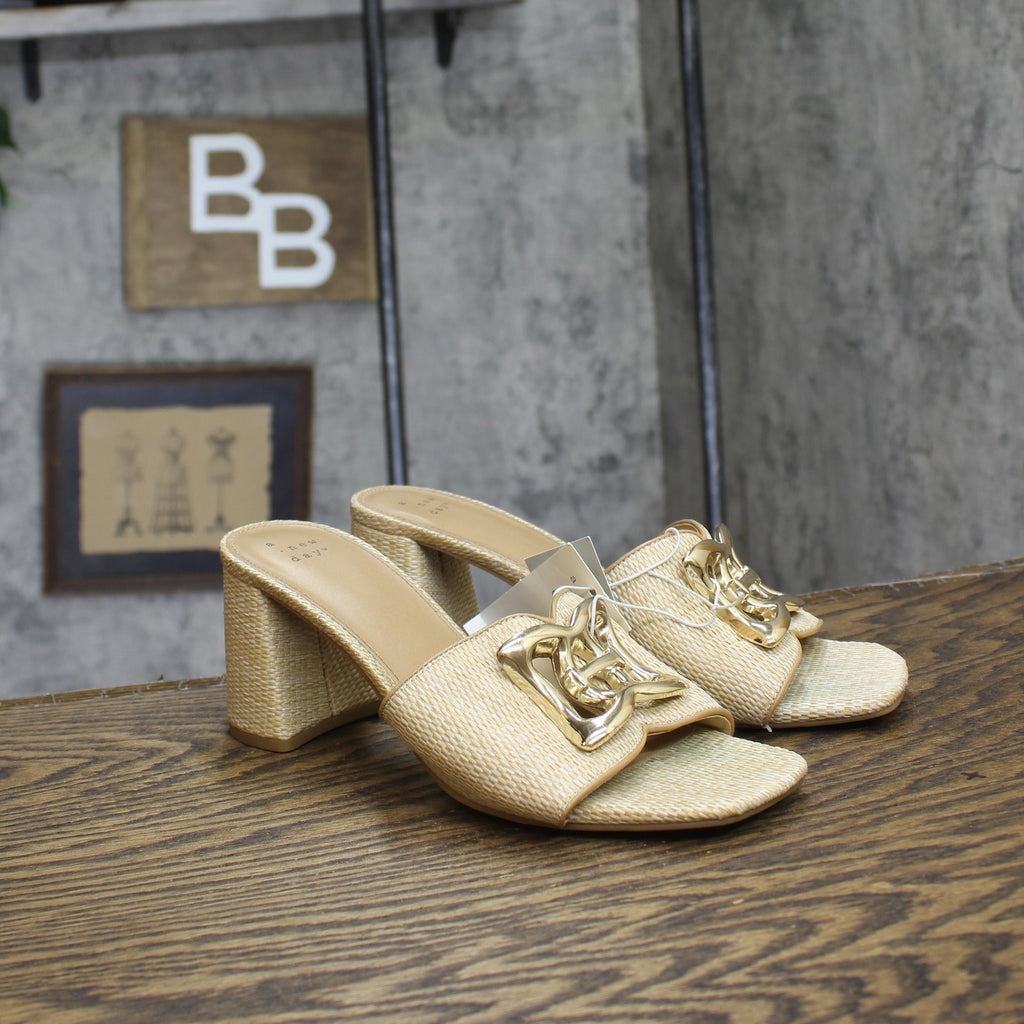 These A New Day Women's Arden Raffia Ornamented Block Heels are a stylish and comfortable choice for women. The shoes feature a beautiful raffia-textured upper in a light beige color, accented by a chic gold-toned ornament. The block heel provides stability and a touch of height, while the memory foam insole ensures all-day comfort. These slides are perfect for adding a touch of elegance to any summer outfit. The size shown is 8 1/2, but other sizes may be available. The unique design and comfortable features make these heels a great addition to your wardrobe. The raffia texture adds a summery feel, making them ideal for warm weather occasions.
