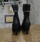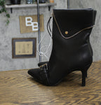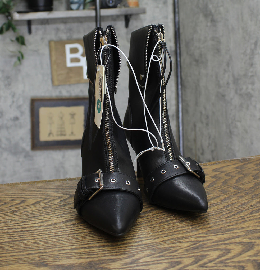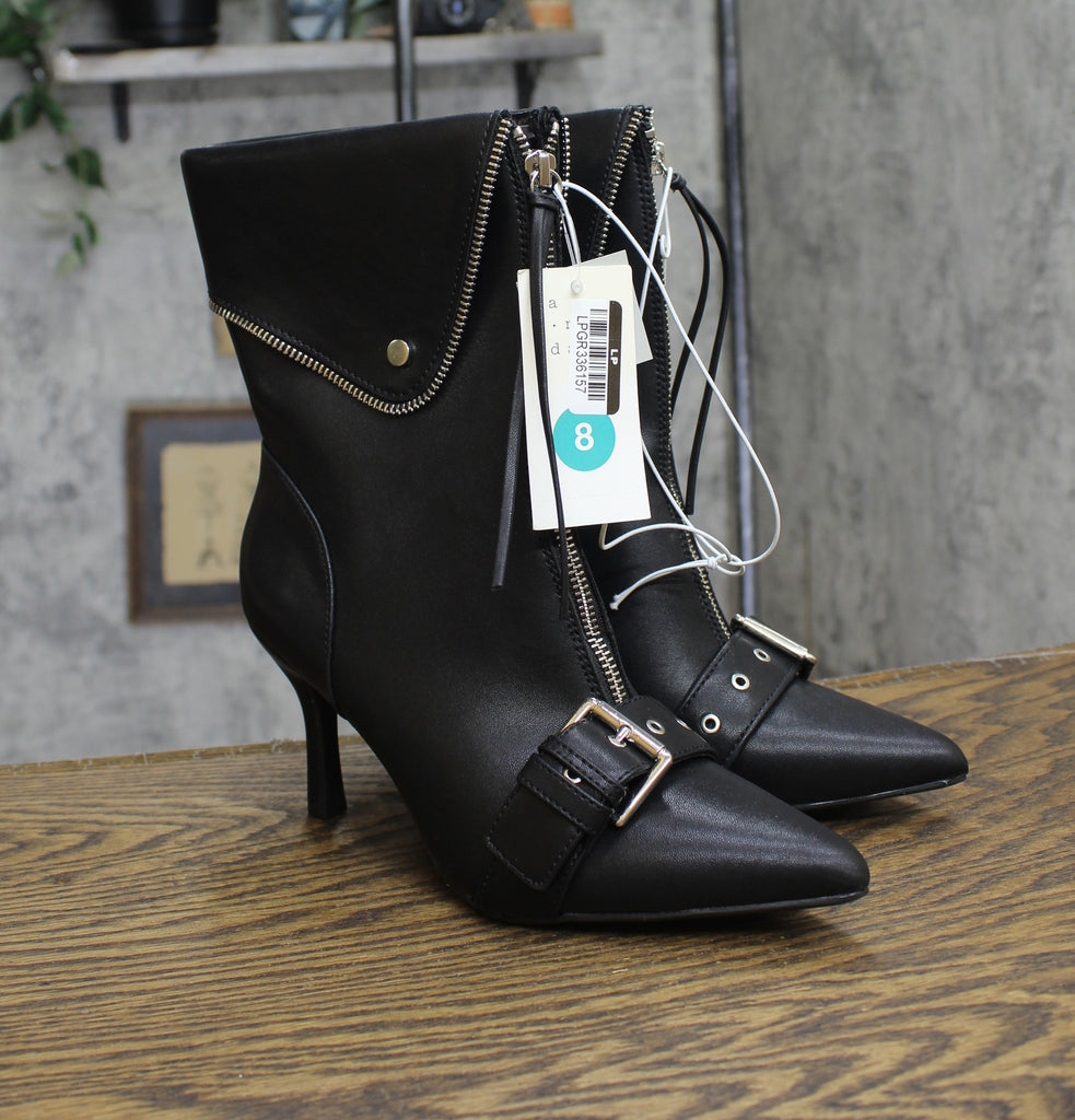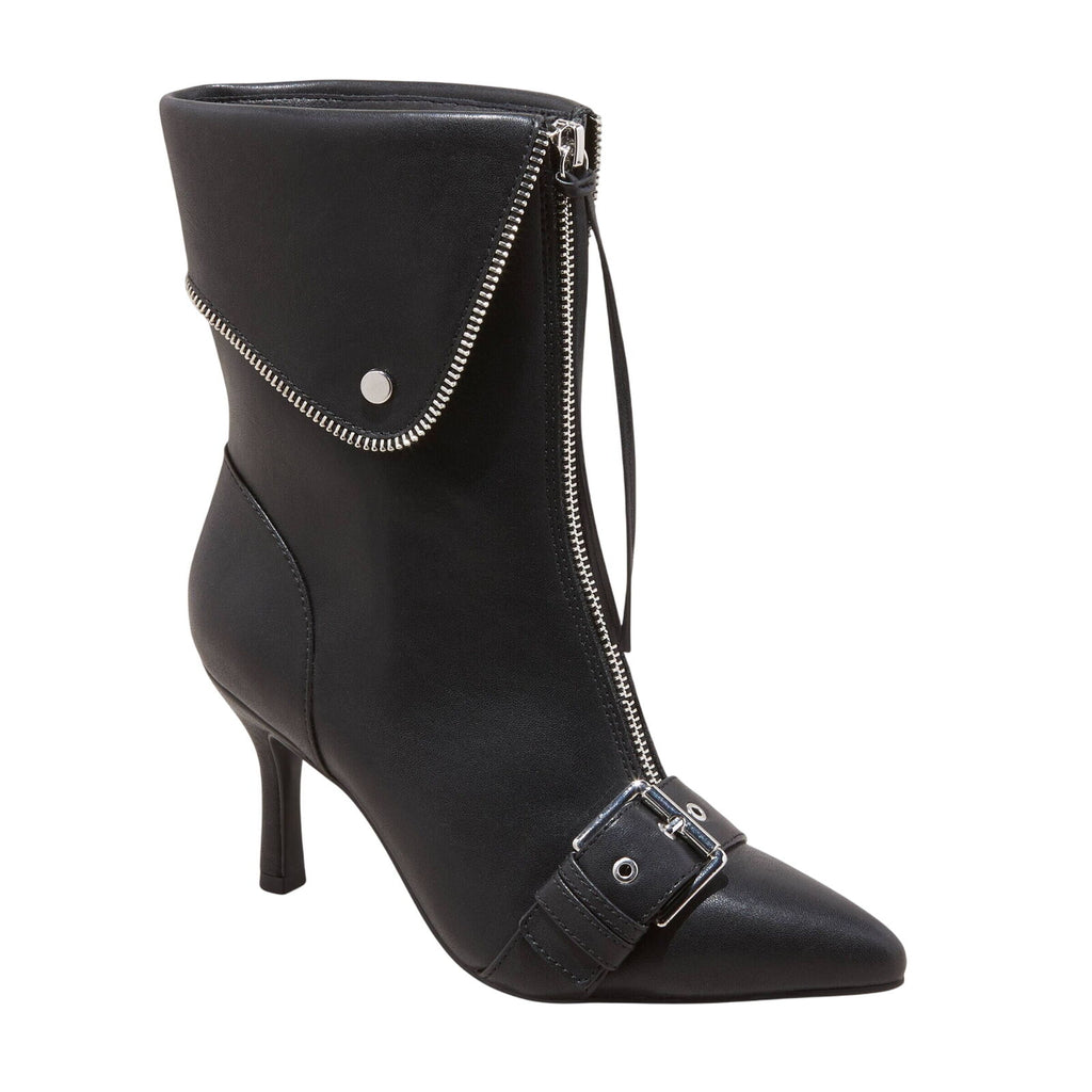 Stay high in style by wearing the Mickey Point Toe Moto Ankle Boots from A New Day. These black boots feature silver zippers and buckle for an eye-catching contrast. Designed with approximately three-inch stiletto heel, these moto boots have cushioned insoles for comfortable walking. A New Day: Style that goes wherever you do. Black moto boots Pointed, closed toe 3in stiletto heel Textured outsole Ankle height Cushioned insole Zipper closure Sizing: Womens Care and Cleaning: Spot or Wipe Clean Footwear Lining Material: 100% Polyester Construction: Cushioned Insole Footwear Insole Material: 100% Polyurethane Features: Zipper Height Type: Ankle Toe Style: Pointed Toe Footwear Upper Material: 100% Polyurethane Footwear Outsole Material: 100% TPR (Thermoplastic Rubber) Heel: Approximately 3.0 Inches Stiletto Heel Boot Shaft Circumference: Approximately 11.5 Inches Boot Shaft Height: Approximately 6.5 Inches Shoe Width: Medium Footwear toe openness: Closed Toe Footwear outsole details: Textured Outsole